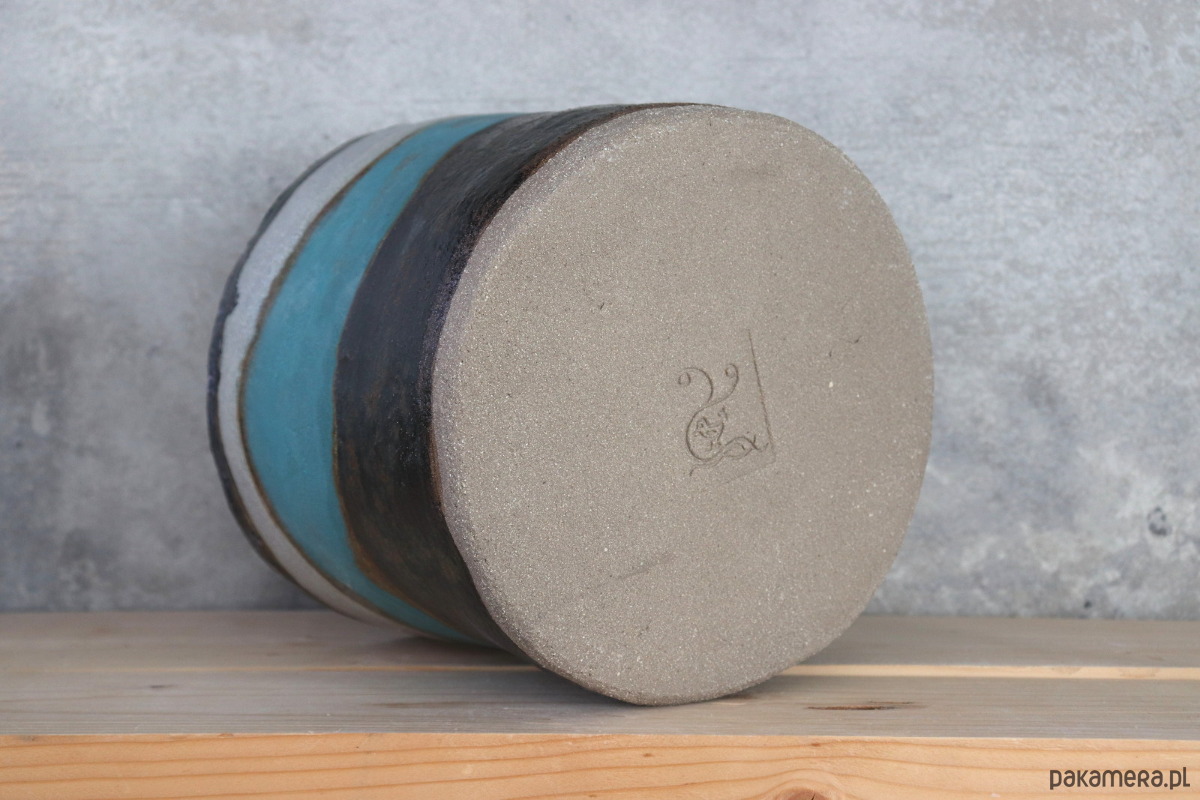 Osłonka wykonana z szarej gliny, zdobiona plamami kolorowych szkliw. Wnętrze osłonki w całości poszkliwione. Wzory na osłonce nie są powtarzalne, więc z każdej strony wygląda nieco inaczej. Naczynie zostało wykonane ręcznie, bez użycia koła garncarskiego.