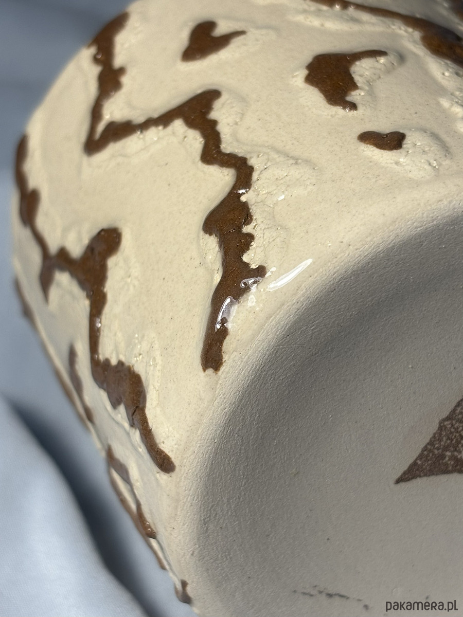 wypukłości uzyskane przez nakładanie warstw masy ceramicznej, podkreślone przy pomocy tlenków żelaza i miedzi
