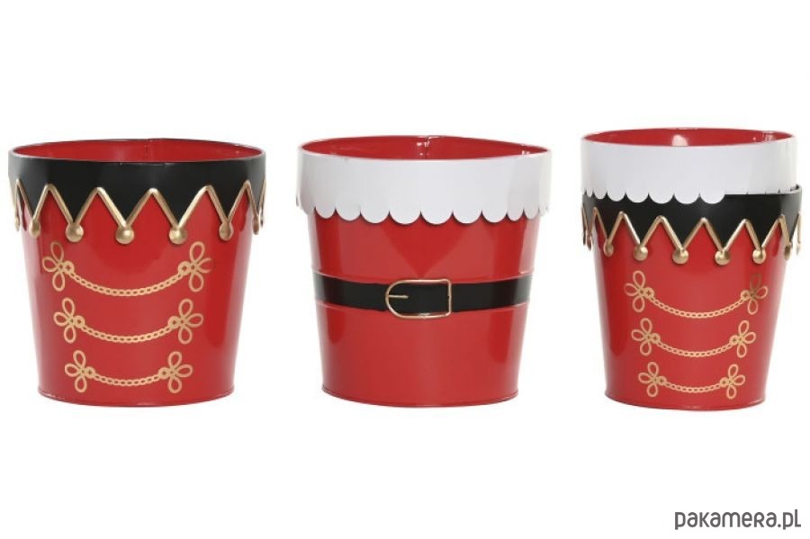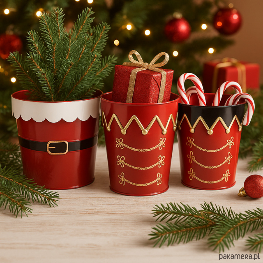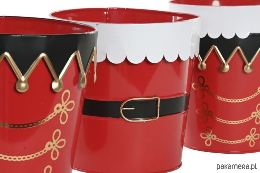 Trzy osłonki na doniczki wykonane z metalu to dekoracja, która przenosi do świata bożonarodzeniowych opowieści. Złote zdobienia, biały kołnierz i charakterystyczny pasek sprawiają, że każdy pojemnik wygląda jak fragment stroju świętego Mikołaja. Odnajdą się w tradycyjnych wnętrzach, ale również w nowoczesnych aranżacjach. Doskonale wyglądają na stole, parapecie, komodzie czy choince, tworząc ciepły i przyjazny klimat.