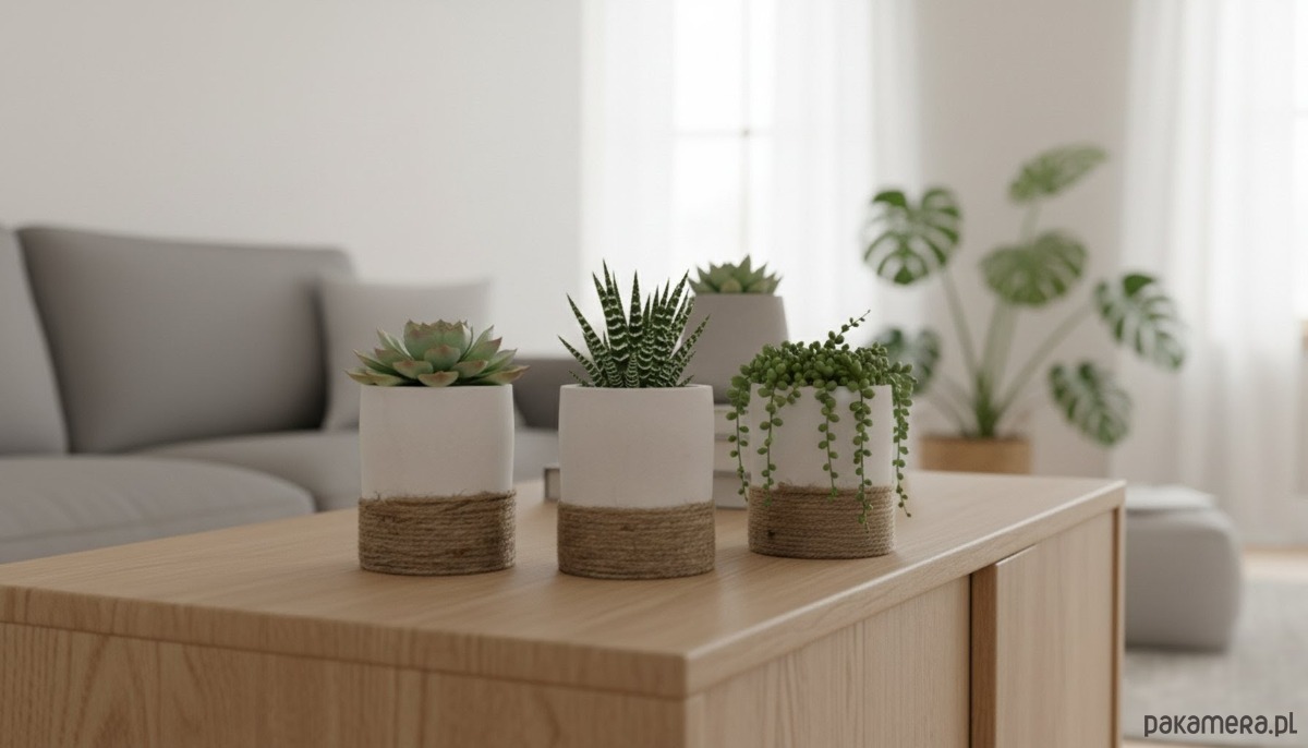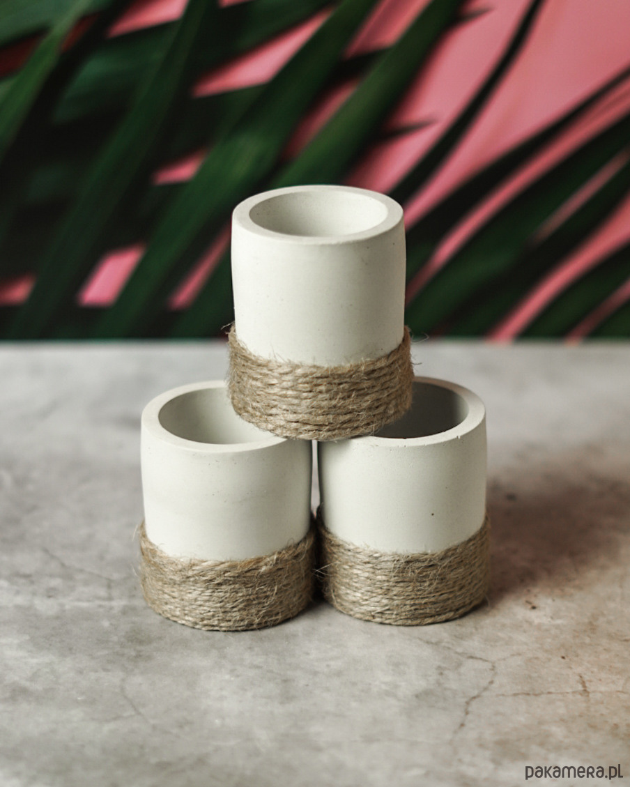 Ręcznie robione osłonki na mini rośliny lub na podgrzewacze wykonane z betonu w kolorze białym, zdobione sznurkiem jutowym. Odpowiednie proporcje cementu i dodatków pozwoliły uzyskać idealny kolor, a zarazem wytrzymałość. Proces obróbki wykonywany jest ręcznie, bez wykorzystania maszyn. Produkt jest zabezpieczony specjalną mieszanką nadającą wytrzymałość, a na samym końcu specjalnym lakierem. Każdy nasz produkt jest inny, nie jest produkowany seryjnie, co nadaje mu niepowtarzalność.