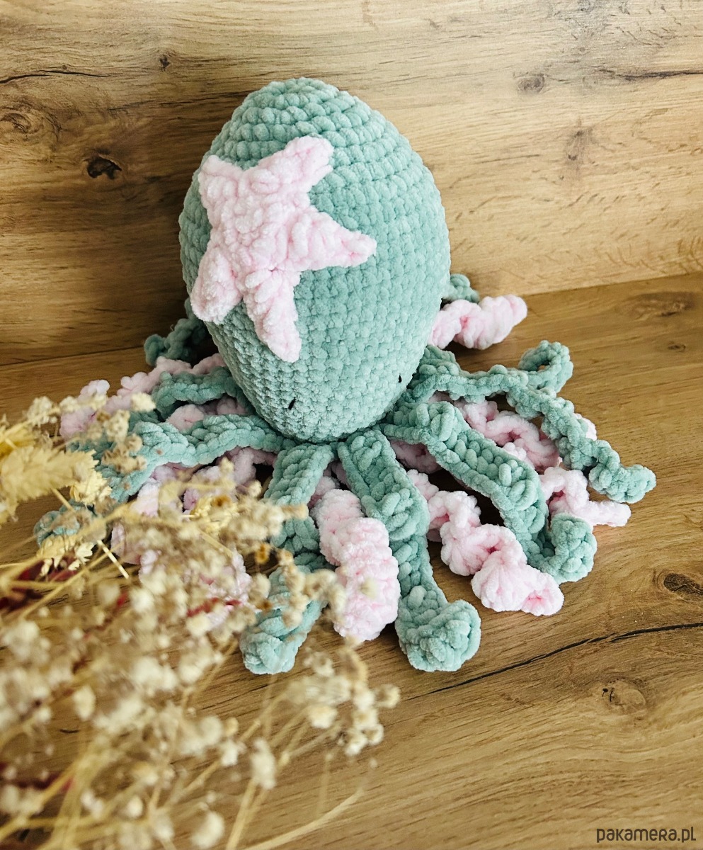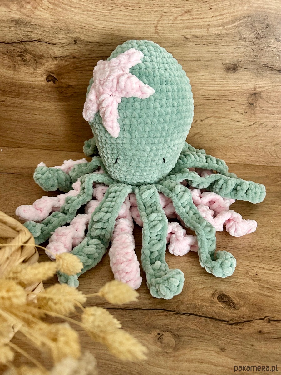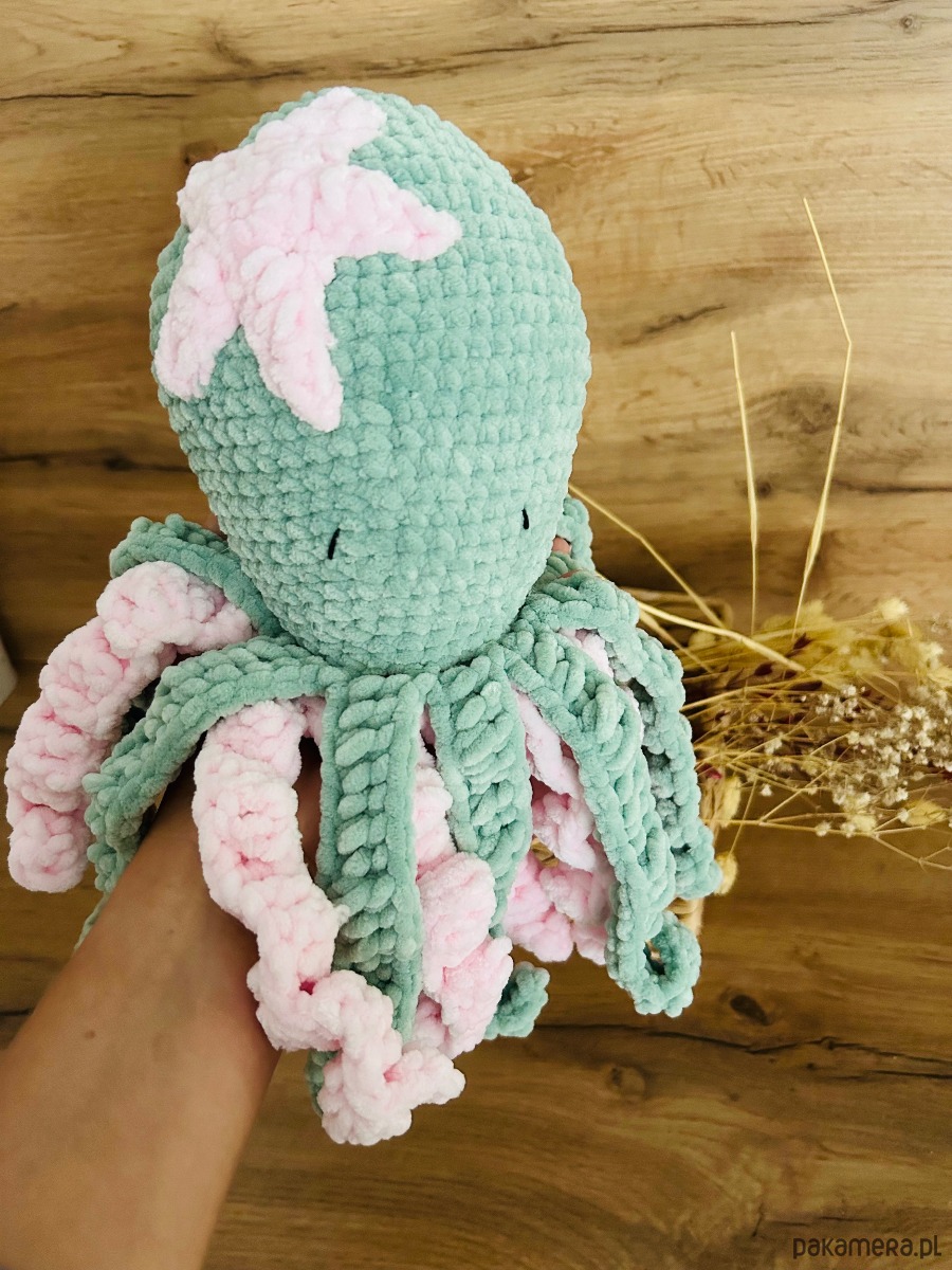 Poznaj wyjątkową, mięciutką ośmiorniczkę wykonaną na szydełku z puszystej, przyjemnej w dotyku włóczki w odcieniach szałwii i jasnego różu.
