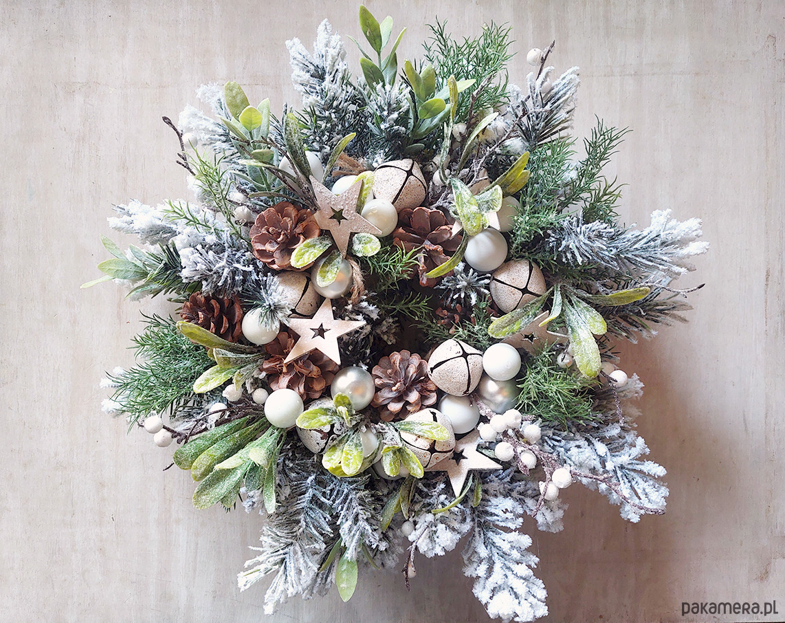 Niebanalny, świąteczny wianek w oryginalnej kolorystyce. Wykonany z wysokiej jakości ośnieżonych sztucznych gałązek świerku, drobnych białych owoców. Udekorowany bombkami, szyszkami i janczarami. Będzie trwałą ozdobą, która świetnie prezentuje się zarówno zawieszona jak i położona np. na stole. Starannie przechowany, będzie cieszył przez wiele świątecznych sezonów. Średnica ok. 35cm