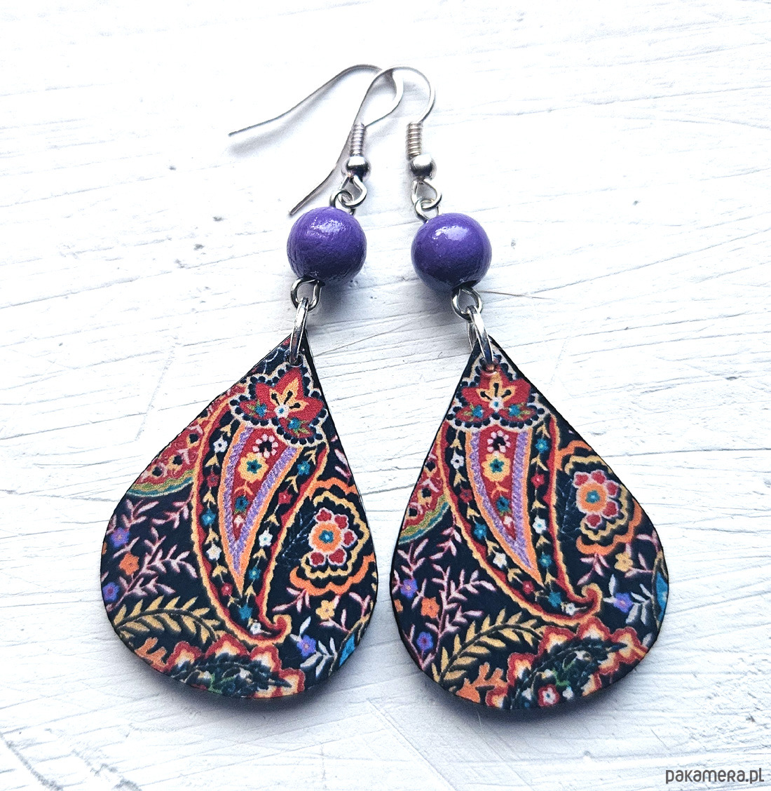 kolczyki drewniane, ozdobione metodą decoupage, dwustronne, starannie wykończone farbami akrylowymi i zabezpieczone wielokrotnie lakierem, koraliki drewniane, bigle posrebrzane, długość kolczyków bez bigli: 5 cm, szerokość: 2,5 cm, bardzo lekkie