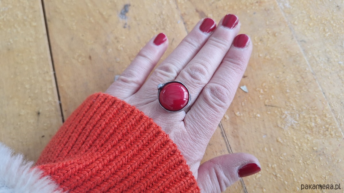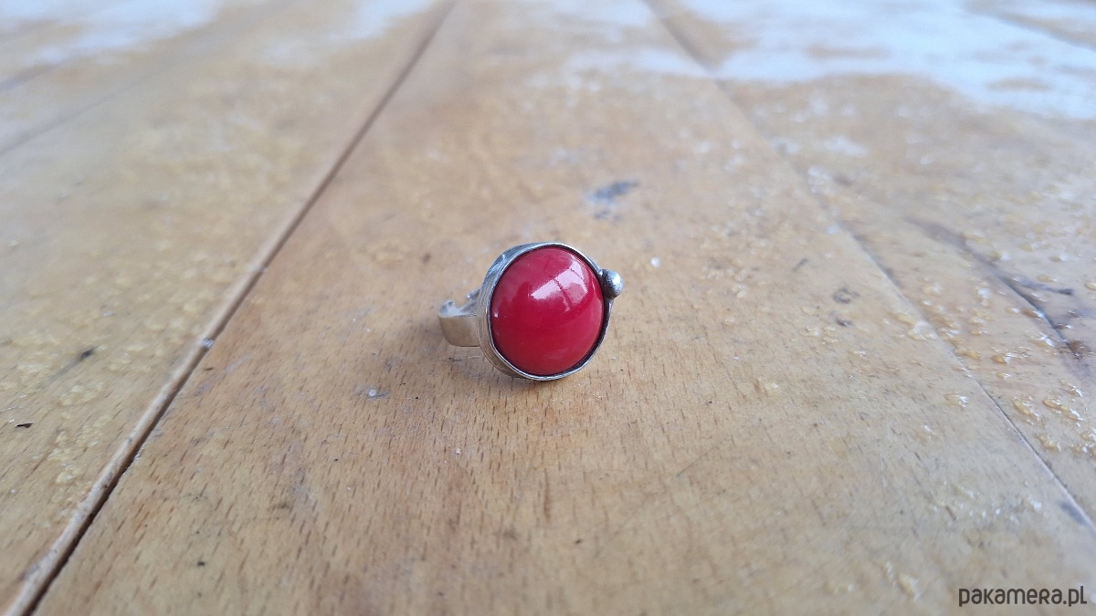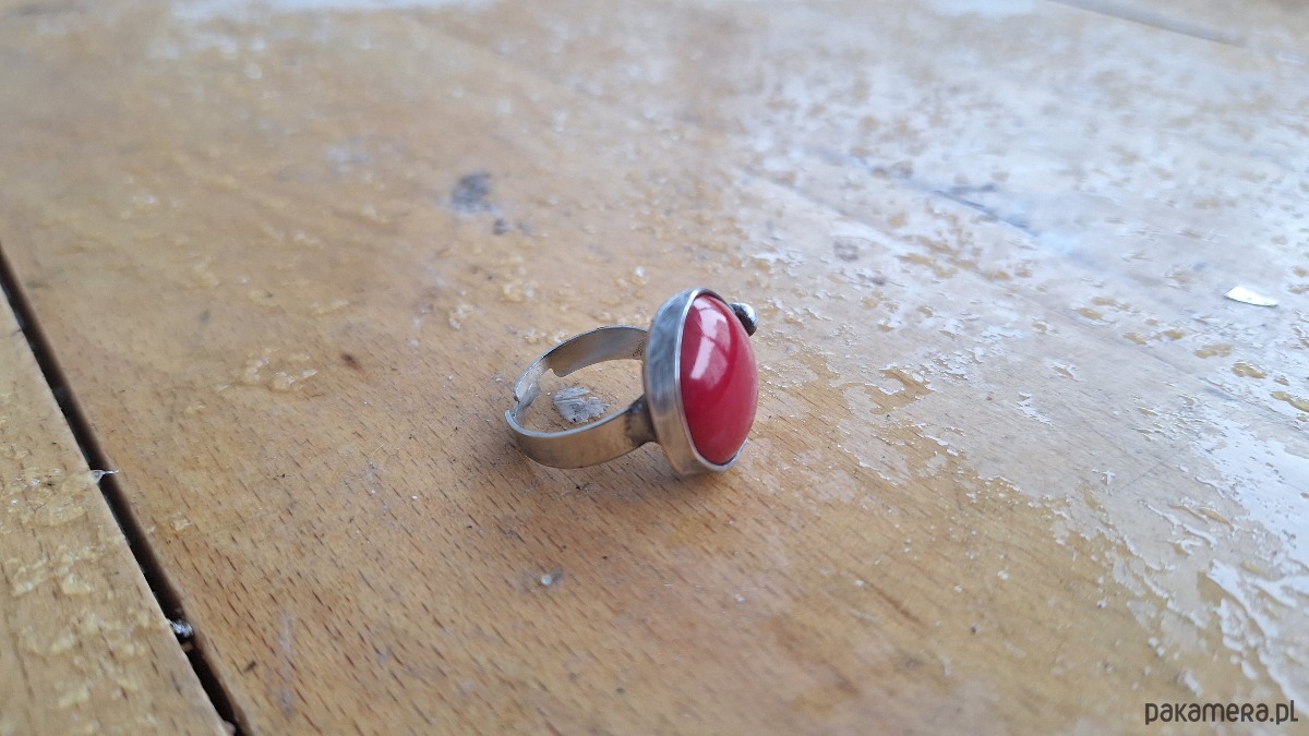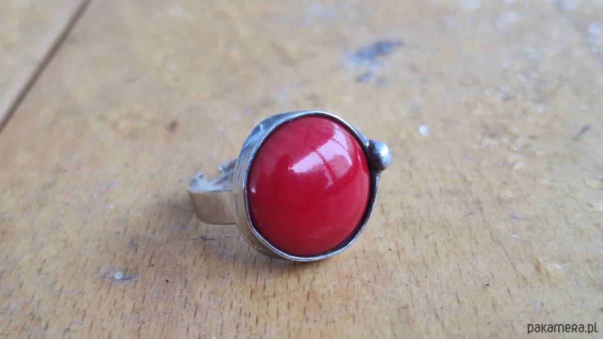 Pierścionek wykonany z miedzi, cyny i szkła. Wymiary ok. 2 na 2 cm. Regulowany. Nie jest ciężki.