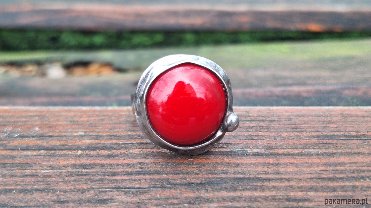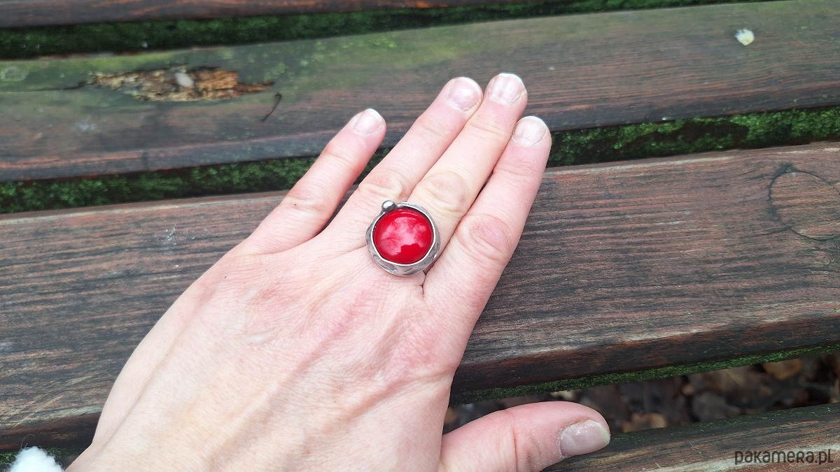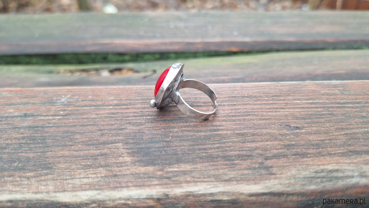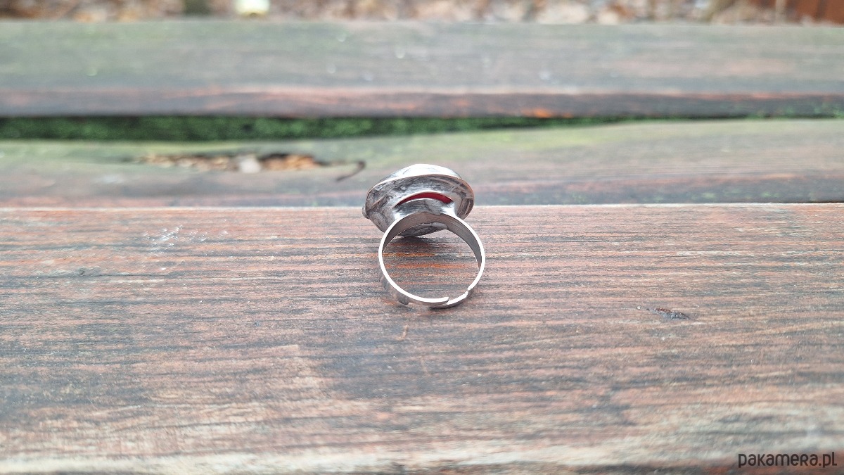 Pierścionek wykonany z miedzi, cyny i szkła. Wymiary ok. 2 na 2 cm. Regulowany. Nie jest ciężki.