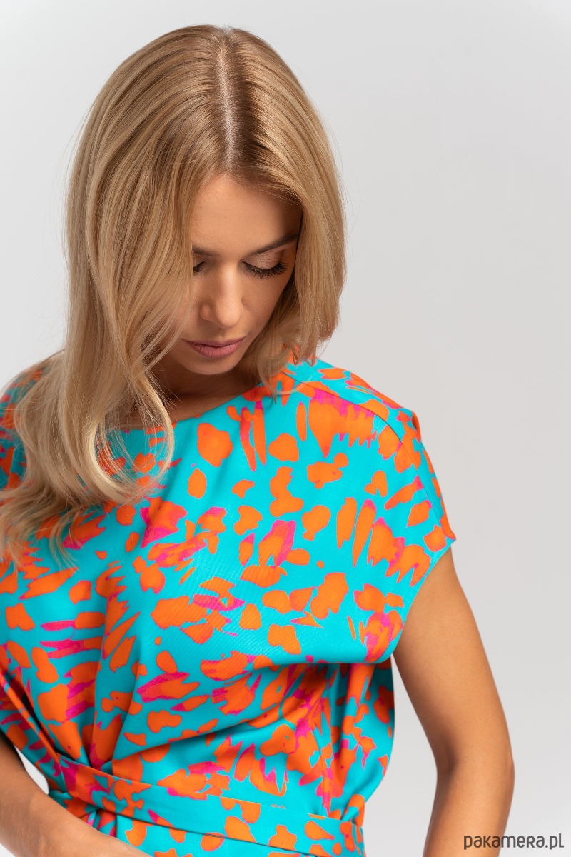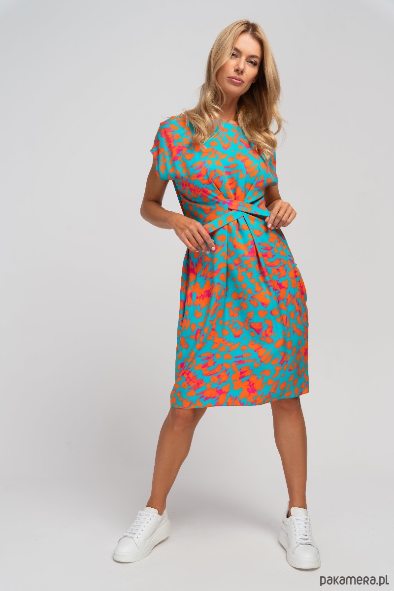 Wiskozowa sukienka bez rękawów, o luźnej formie. Długość midi do kolan. Na biodrach dwie niewidoczne kieszenie, wpuszczone w szwie. W talii z przodu naszyte dwa skrzyżowane paski, które zawiązane z tyłu ładnie podkreślają sylwetkę. Sukienka zapinana jest z tyłu na kryty suwak. Na ramionach wychylenie, które bez szwów tworzy niewielki rękawek. Gładka tkanina z lekkim połyskiem wiskozy przełamana wzorem w intensywnych kolorach.
