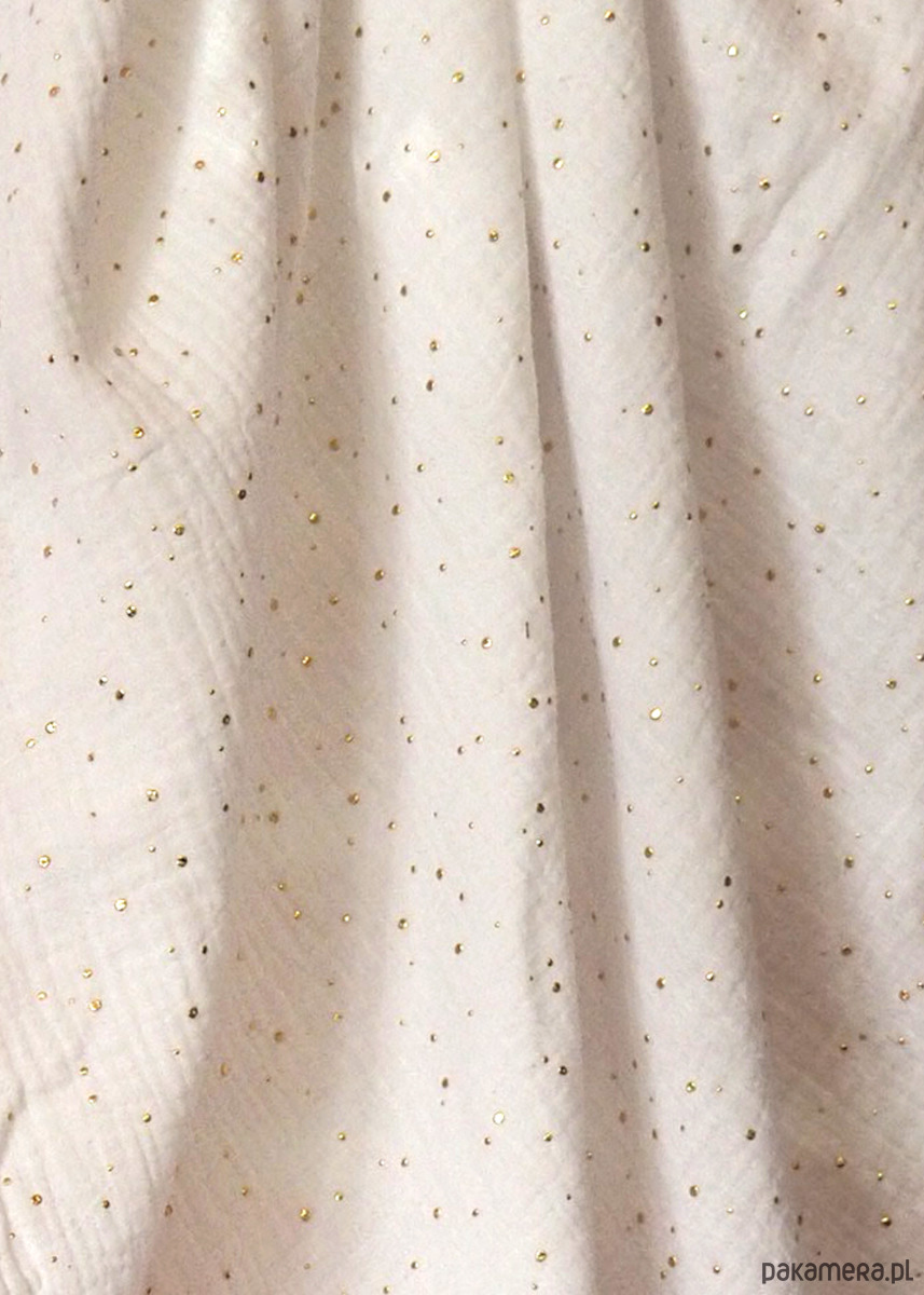 Oddaję w Twoje ręce efemeryczny muślinowy otulacz w kolorze białym, okraszony złotymi kropkami. Idealny dla niemowlaczka w podróży, w domu czy na spacerze, do otulenia delikatnej skóry przed wiatrem, słońcem czy ciekawskim spojrzeniem.