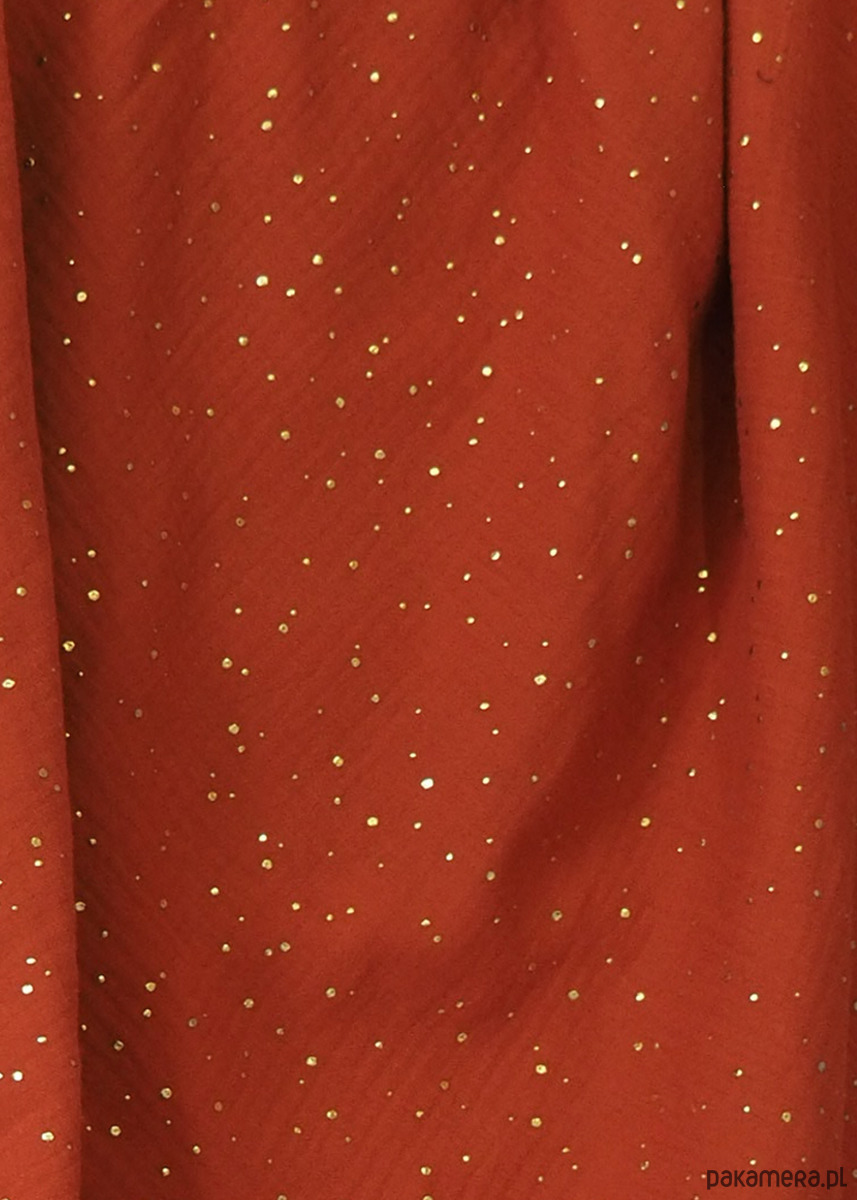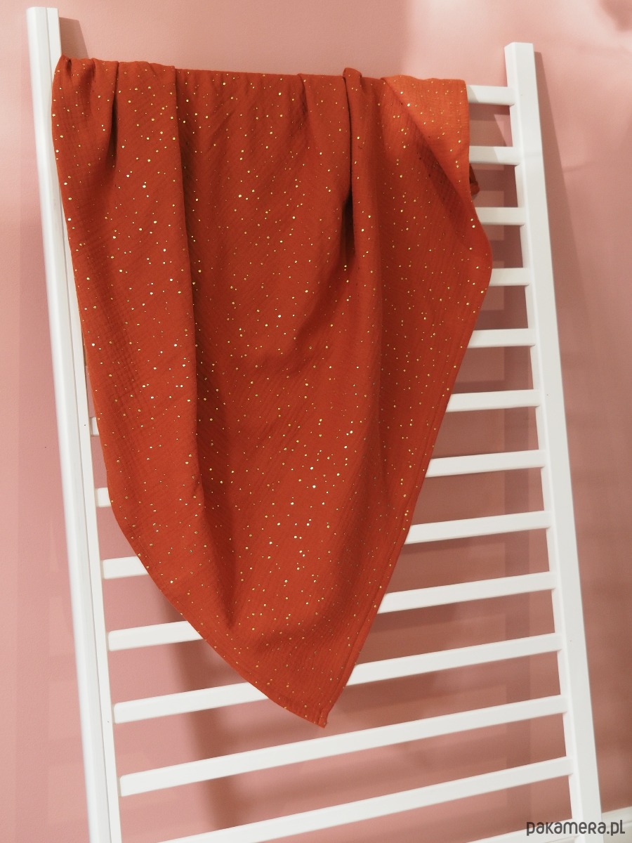 Oddaję w Twoje ręce efemeryczny muślinowy otulacz w kolorze rudym, okraszony złotymi kropkami. Idealny dla niemowlaczka w podróży, w domu czy na spacerze, do otulenia delikatnej skóry przed wiatrem, słońcem czy ciekawskim spojrzeniem.