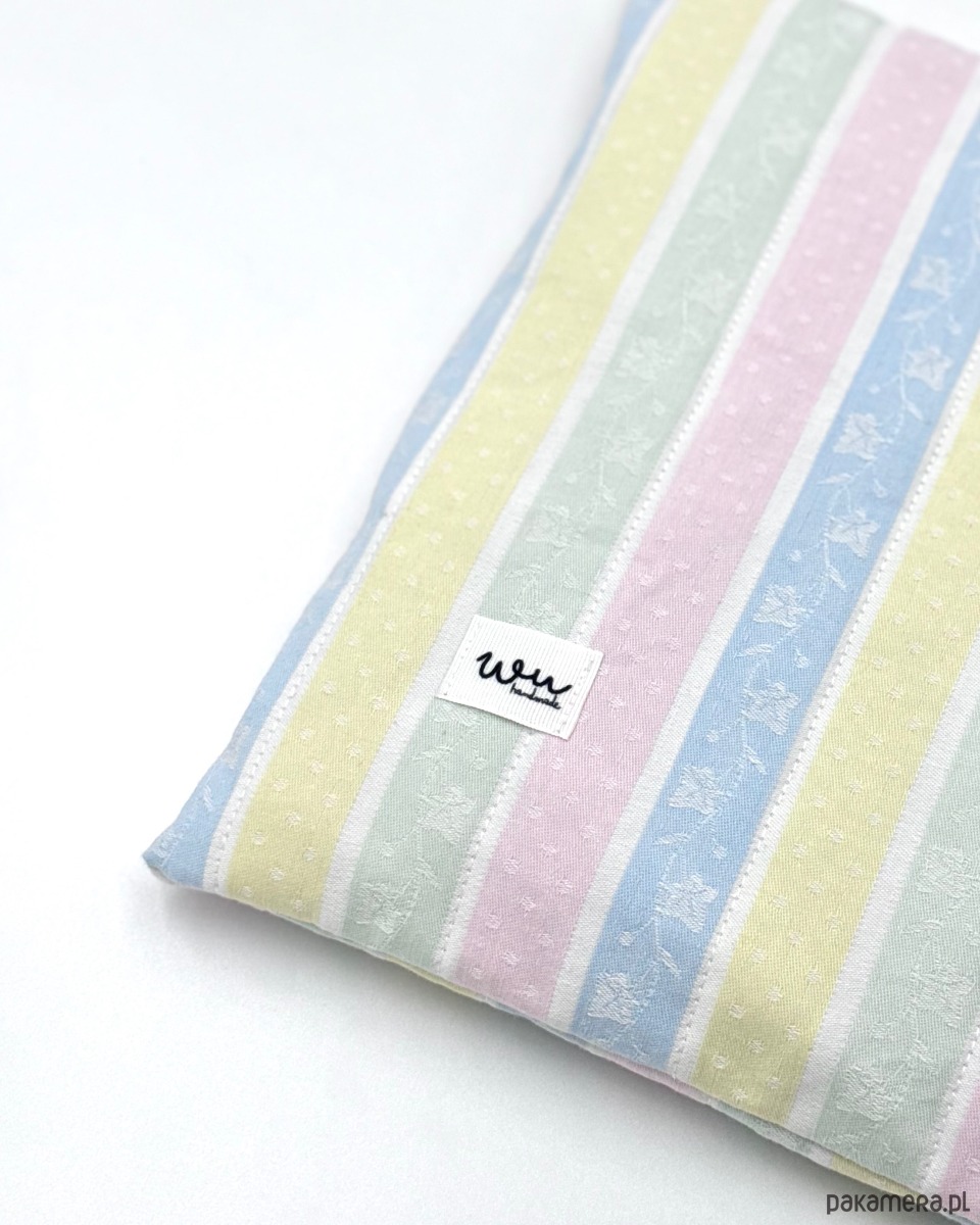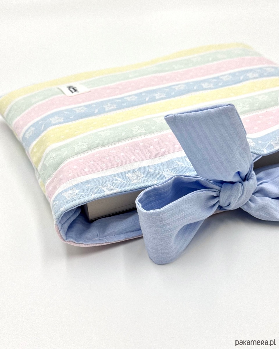 Otulacz/pokrowiec na książkę, uszyty z unikatowych tkanin z drugiego obiegu.