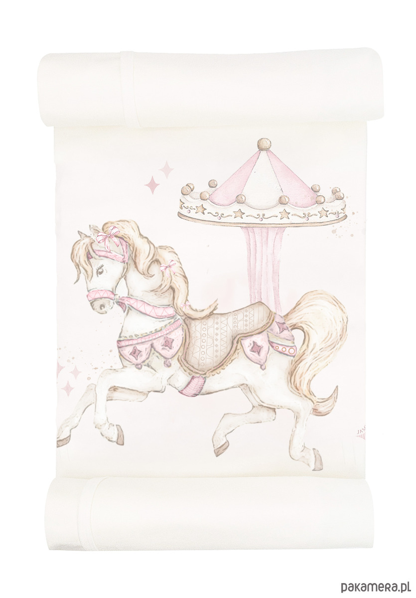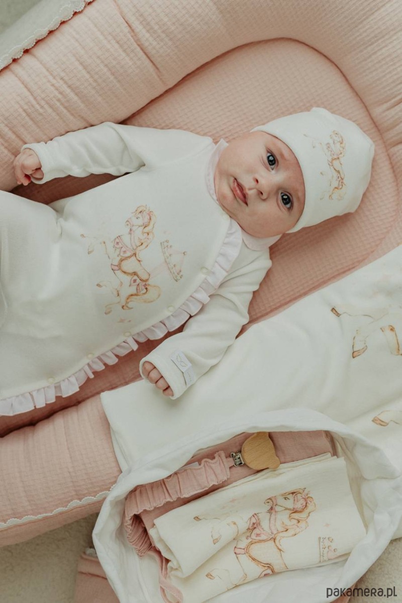 Niezwykle delikatny w dotyku otulacz niemowlęcy zdobiony nadrukiem konika w stylu vintage.