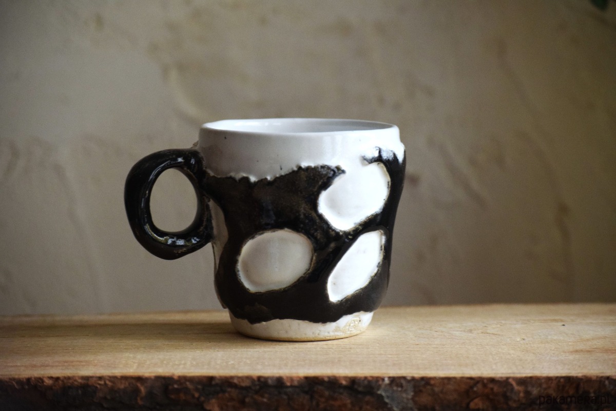 Ten kubek wytoczyłam z jasnej gliny na kole garncarskim. Następnie poszkliwiłam go na biało, a ozdobną fakturę na czarno.