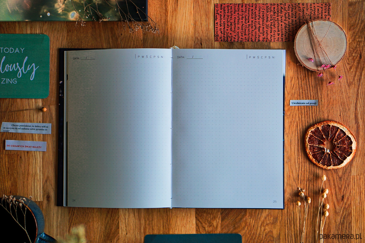 Może służyć jako klasyczny notatnik, ale także jako bullet journal, planner lub kalendarz (na każdej stronie znajduje się miejsce do zaznaczenia dnia i wpisania daty).