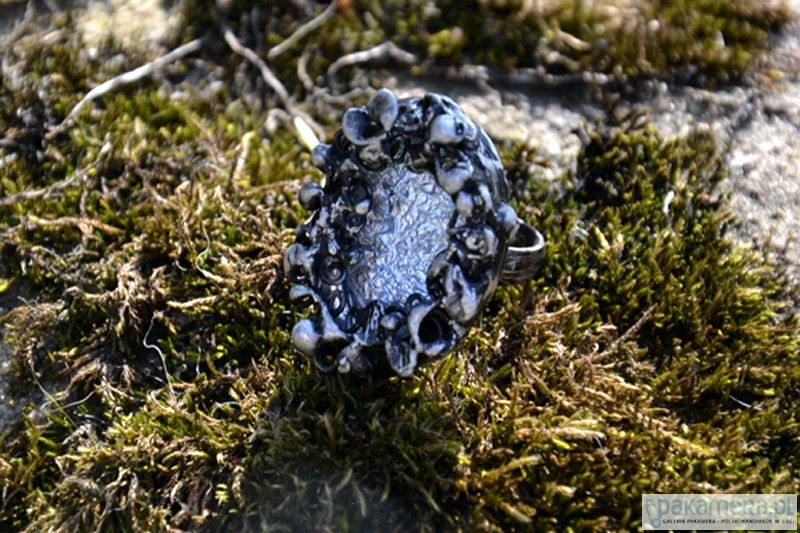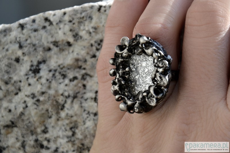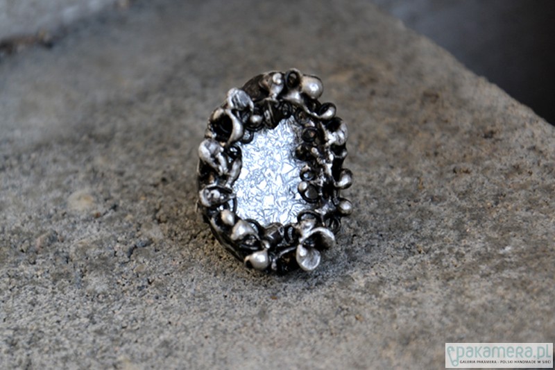 Efektowny, dekoracyjny przyciągający spojrzenia pierścionek ze szkłem. Wymiary szkła wraz ze stylizowaną na stare srebro oprawą wykonana z ekologicznej cyny to ok. 3 x 2 cm. Obrączka regulowana. Biżuteria w 100% wykonana ręcznie, poszczególne sztuki mogą się minimalnie różnić.