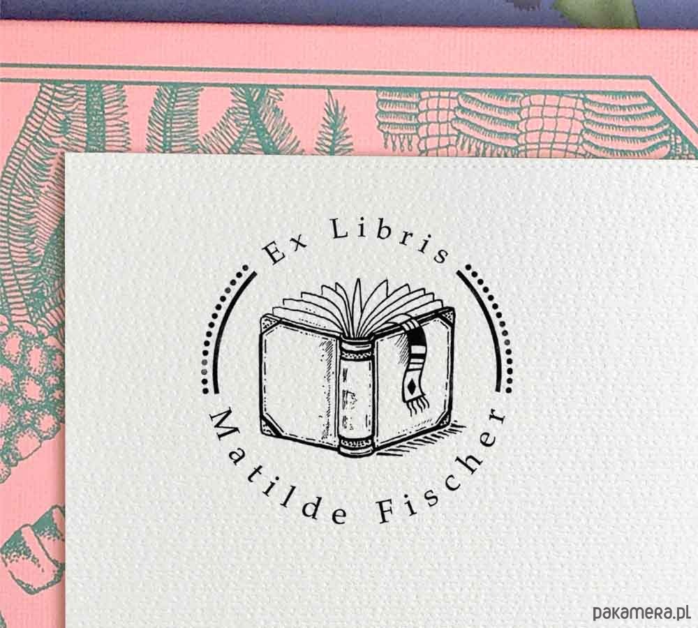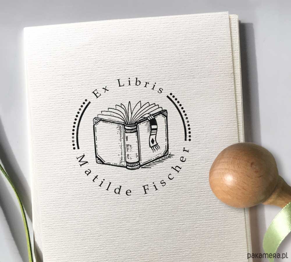 Exlibris na zamówienie przedstawia otwartą książkę od strony okładki z wystającą zakładką. Projekt graficzny stempla powstał na bazie odręcznego rysunku. Pieczątka ma okrągły kształt, a napis okala ilustrację.