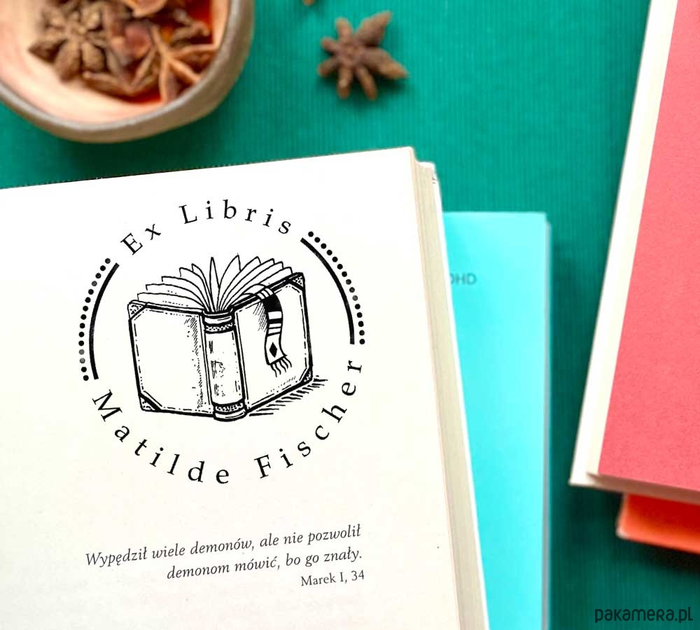 Ta piękna pieczątka jest oryginalnym prezentem dla miłośnika książek. Neutralny temat ekslibrisu sprawi, że sprawdzi się jako niezobowiązujący upominek z okazji wydarzeń firmowych jak imieniny, Mikołajki, czy na odejście koleżanki bądź kolegi z pracy.