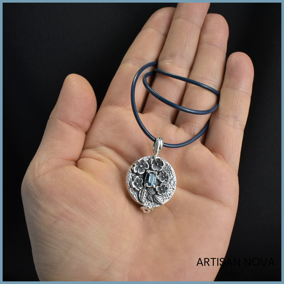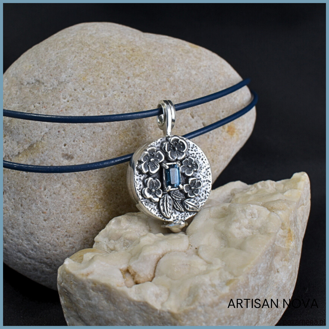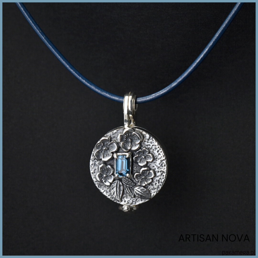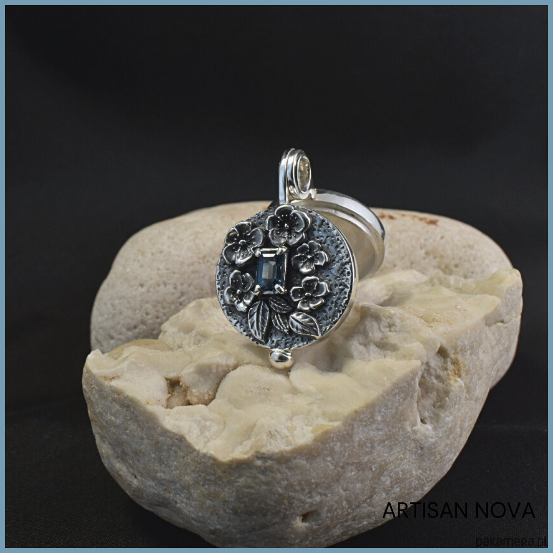 Forma medalionu jest wyjątkowa, ponieważ łączy surowość fakturowanej i oksydowanej powierzchni z błyszczącym, eleganckim wykończeniem. W ten sposób uzyskano efekt kontrastu, który podkreśla detale. Całość ozdobiono motywem delikatnych kwiatów niezapominajek, co dodaje mu romantycznego charakteru. W centrum kompozycji umieszczono przepiękny, fasetowany topaz London Blue, którego niezwykły, głęboki kolor od razu przyciąga wzrok.