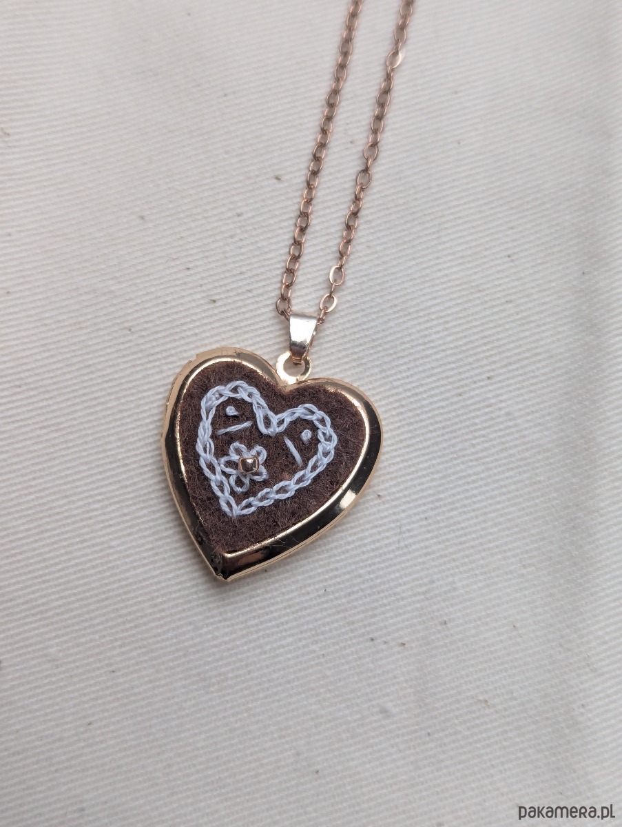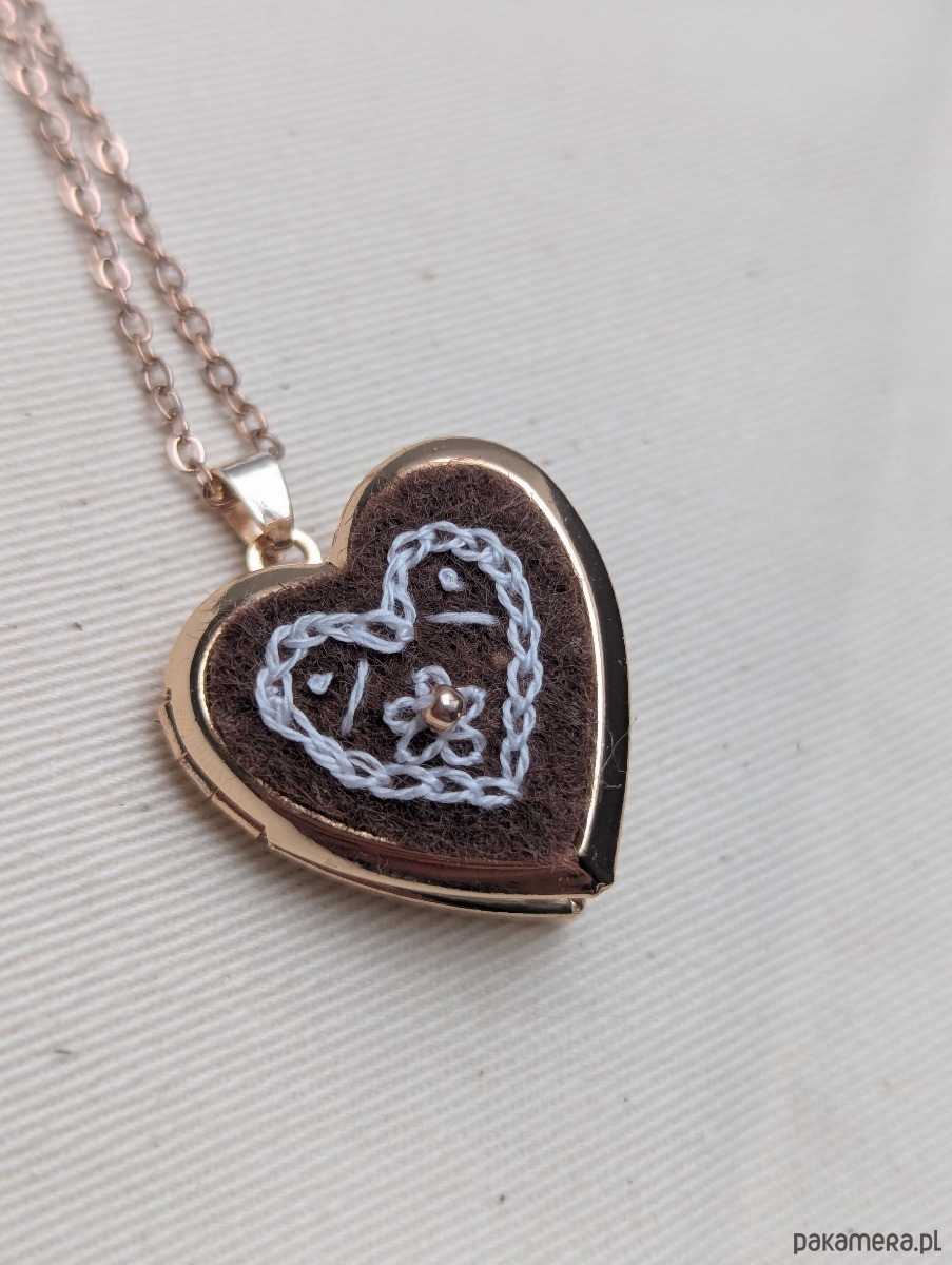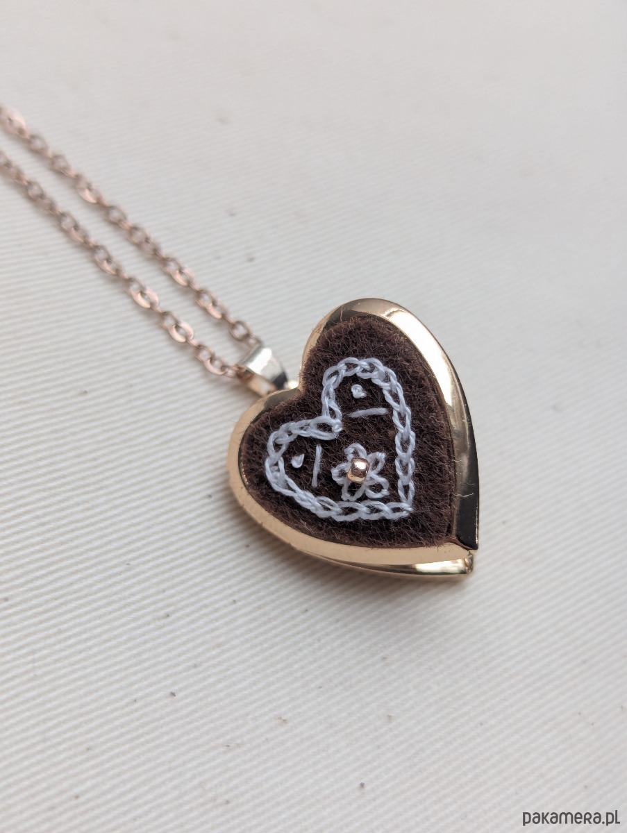 Ten wyjątkowy naszyjnik inspirowany świątecznym pierniczkiem w kształcie serca, został ręcznie wyhaftowany na brązowym filcu. Delikatny biały haft układa się niczym lukier na świątecznym ciasteczku, a doszyty koralik dodaje całości blasku i uroku.