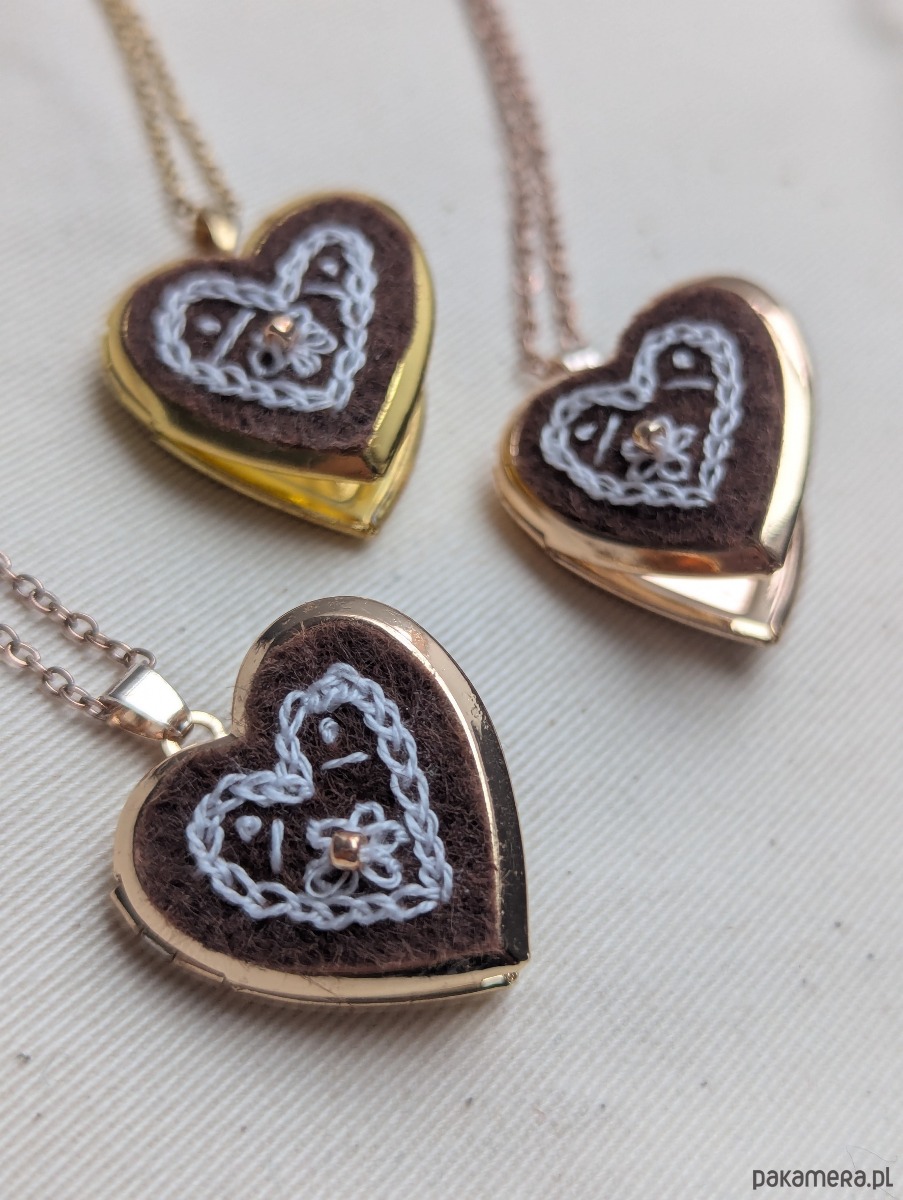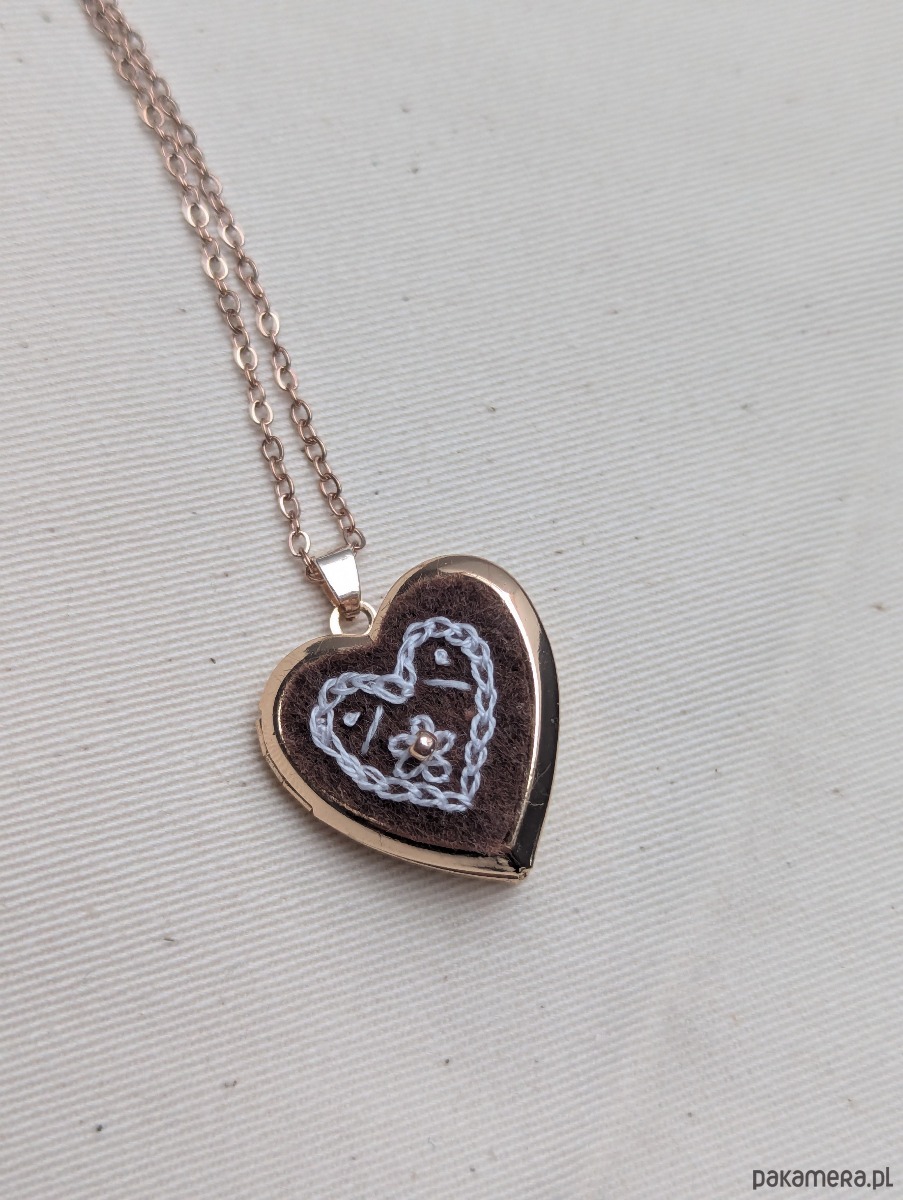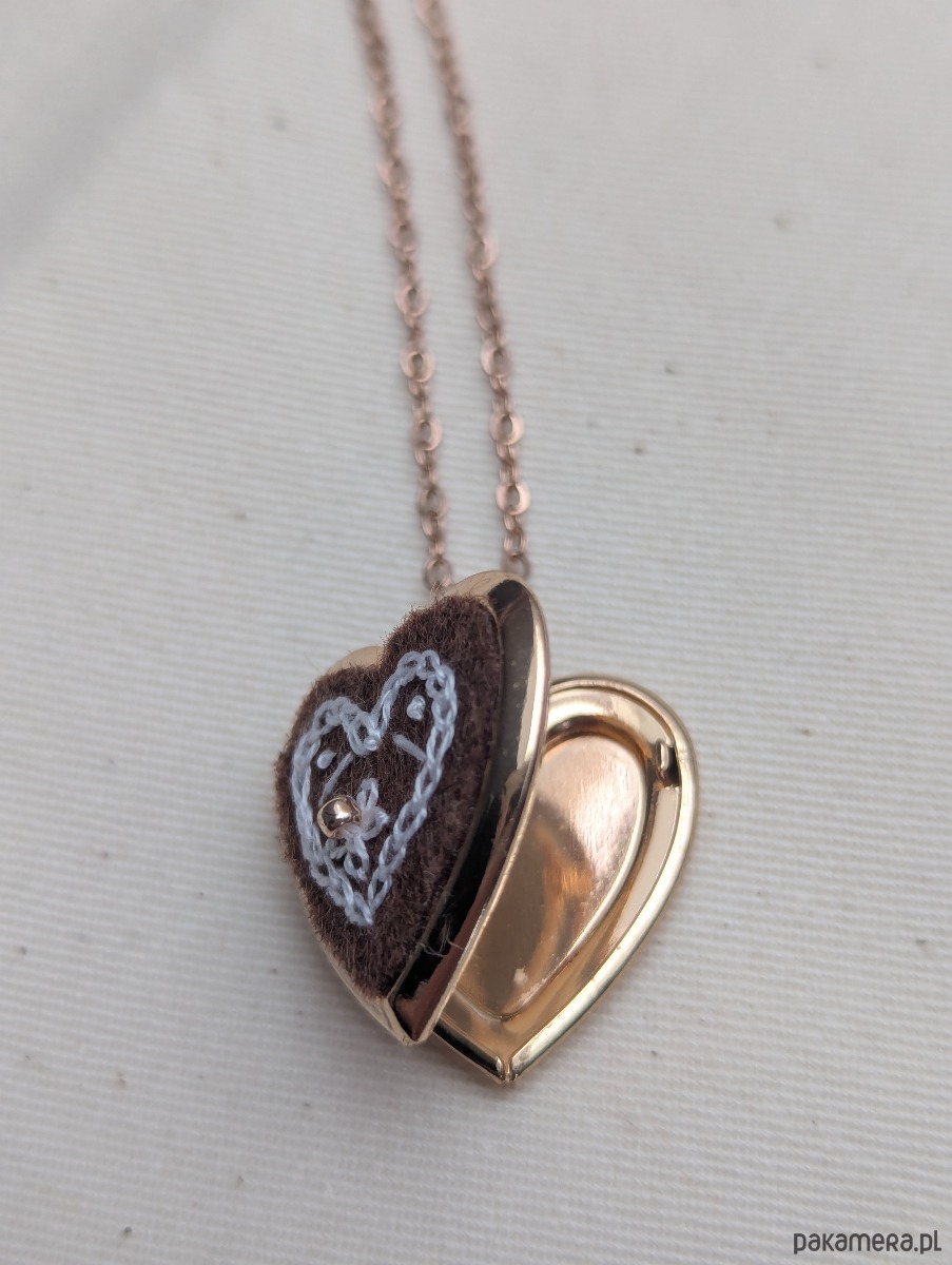 Ten wyjątkowy naszyjnik inspirowany świątecznym pierniczkiem w kształcie serca, został ręcznie wyhaftowany na brązowym filcu. Delikatny biały haft układa się niczym lukier na świątecznym ciasteczku, a doszyty koralik dodaje całości blasku i uroku.