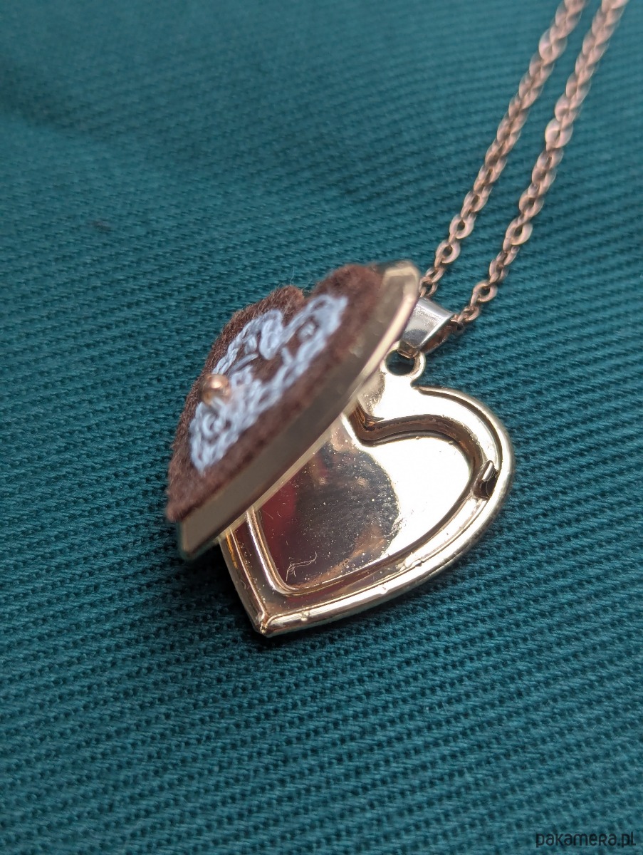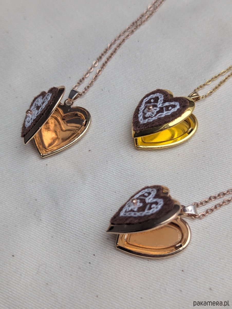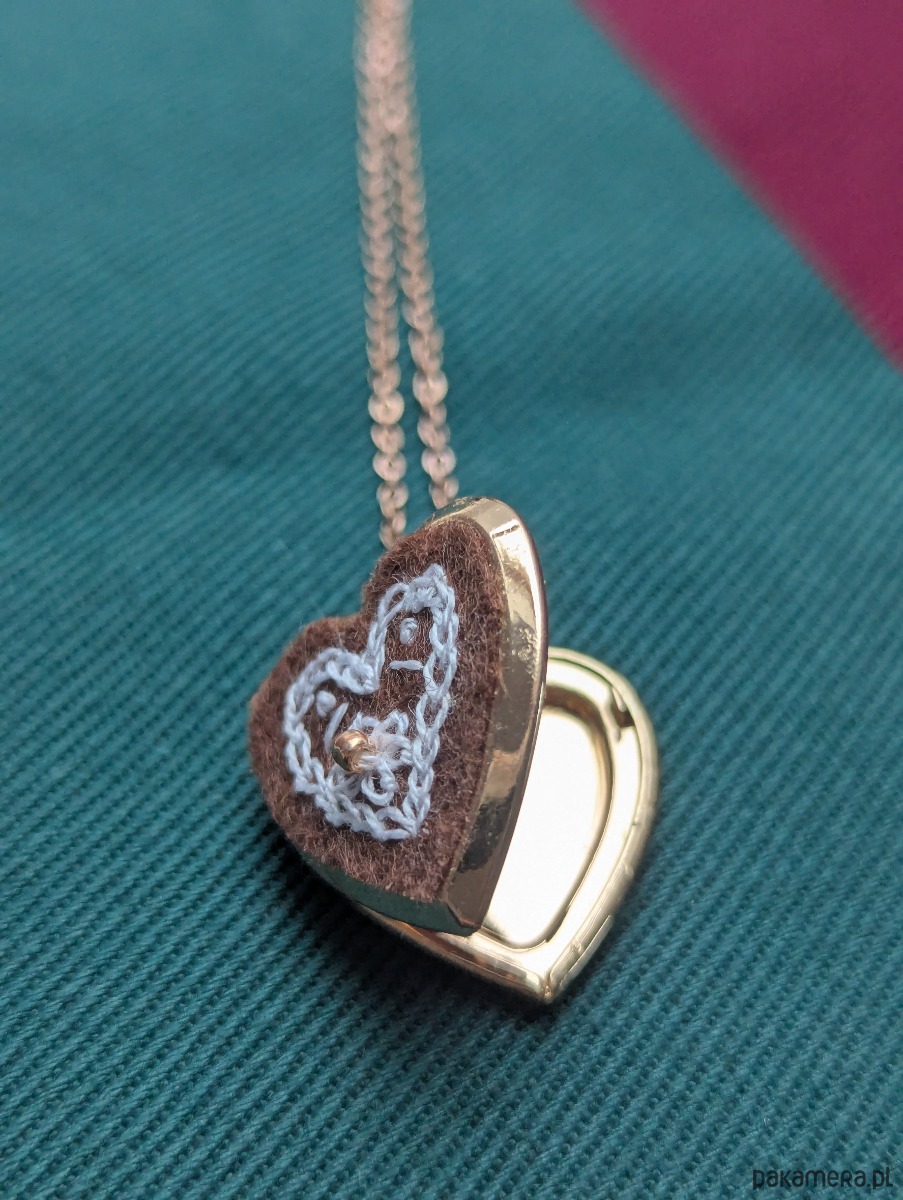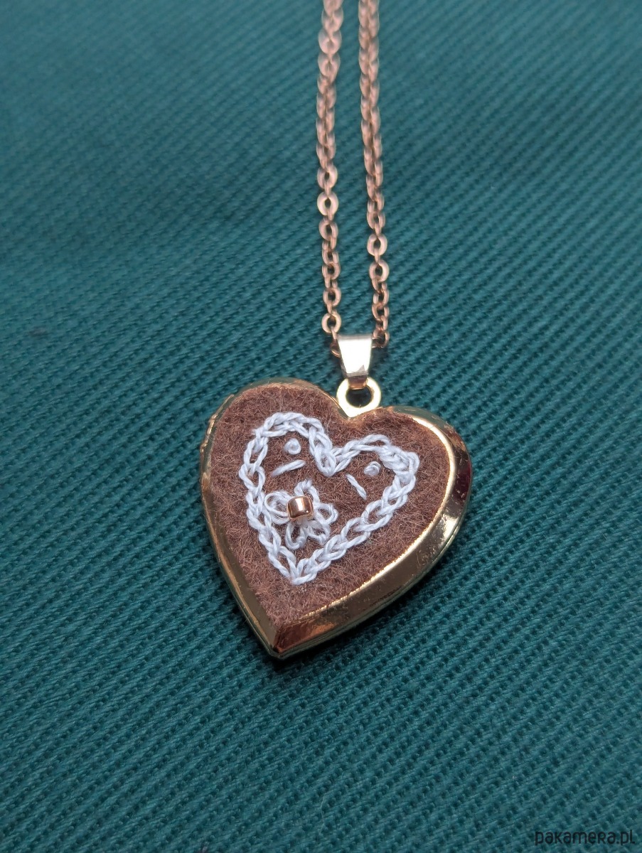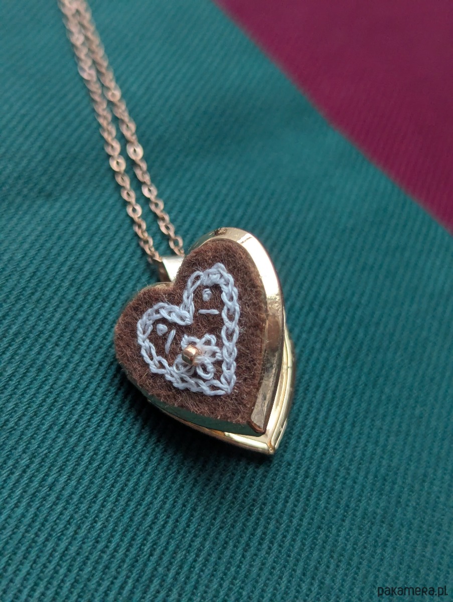 Ten wyjątkowy naszyjnik inspirowany świątecznym pierniczkiem w kształcie serca, został ręcznie wyhaftowany na brązowym filcu. Delikatny biały haft układa się niczym lukier na świątecznym ciasteczku, a doszyty koralik dodaje całości blasku i uroku.