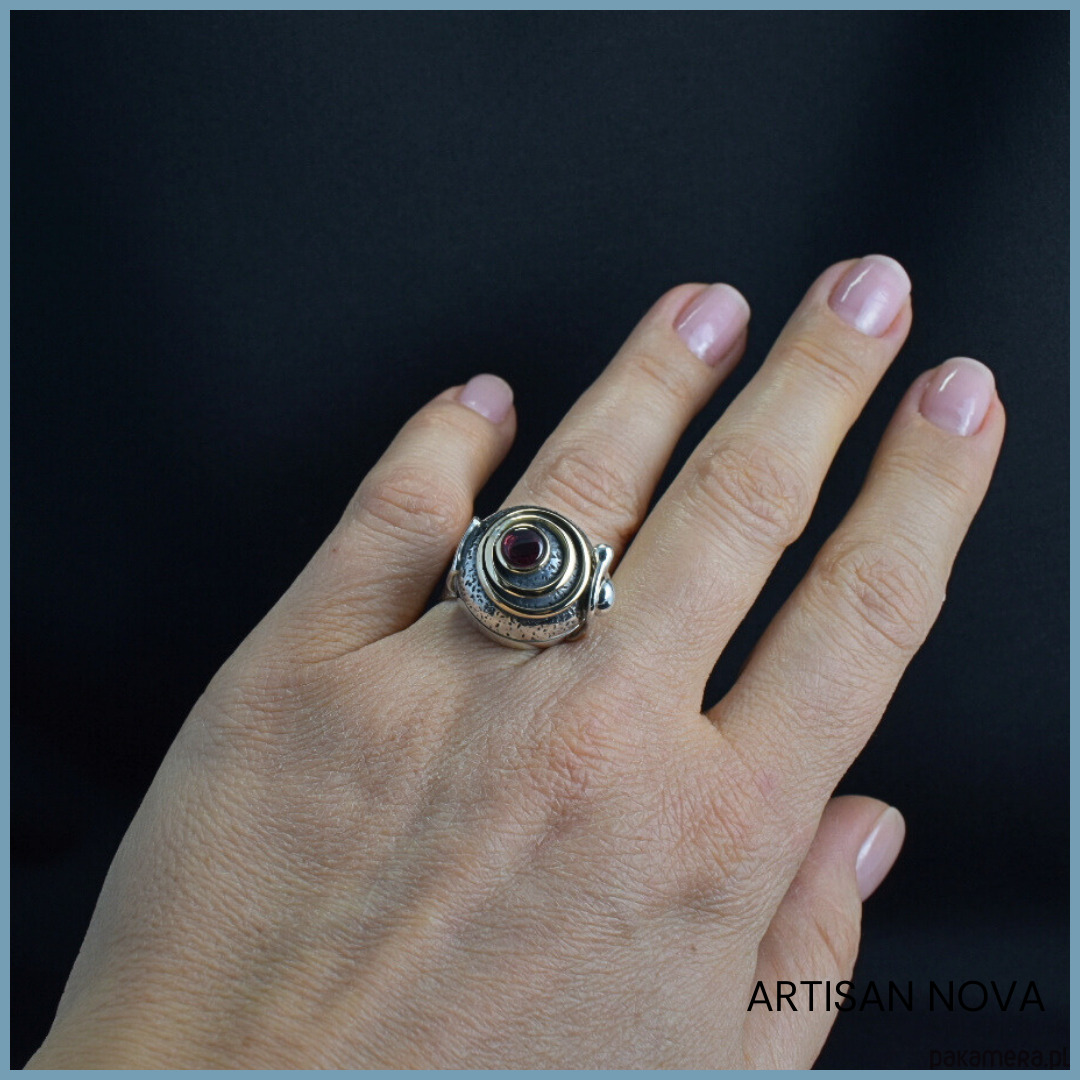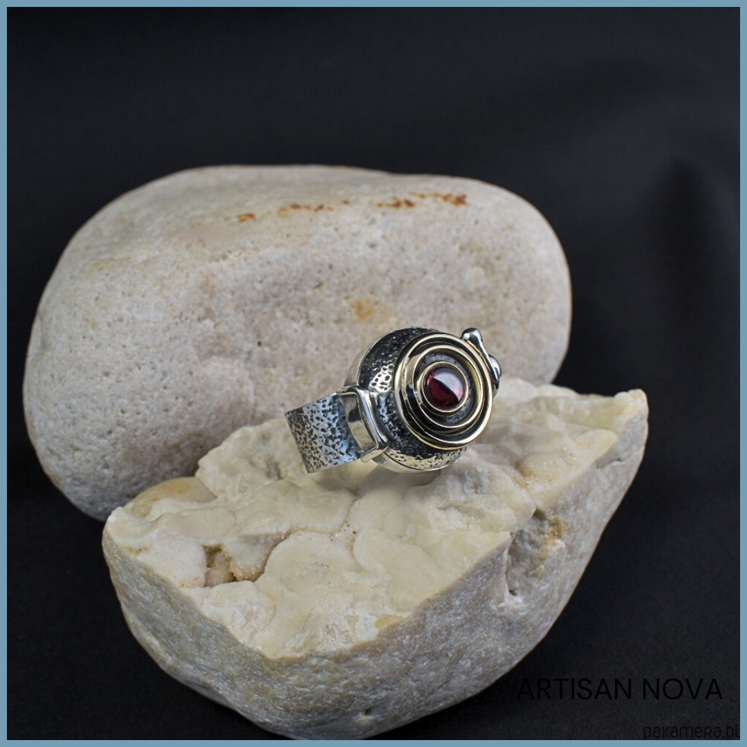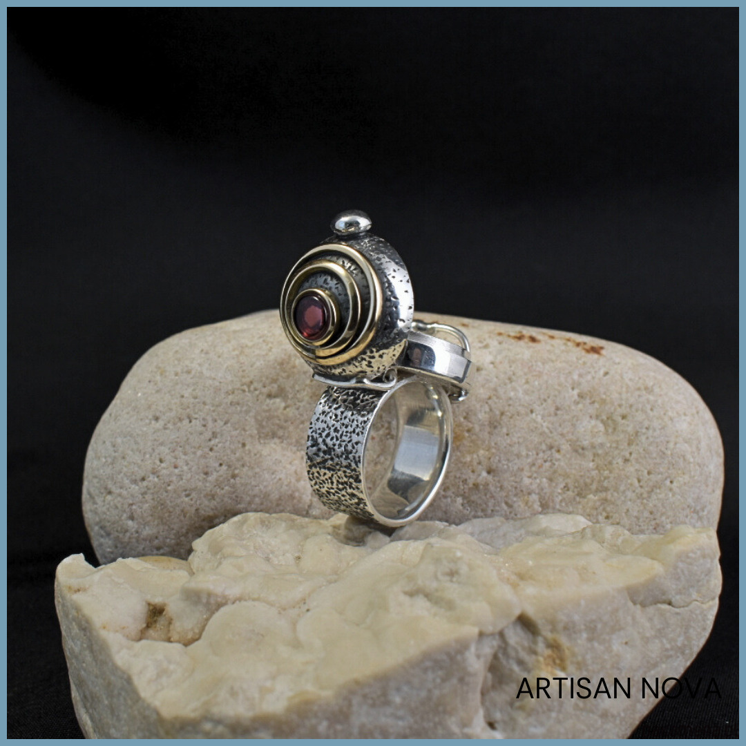 Otwierany Pierścionek Sekretnik ze Srebra, Złota i Granatu rozmiar 12