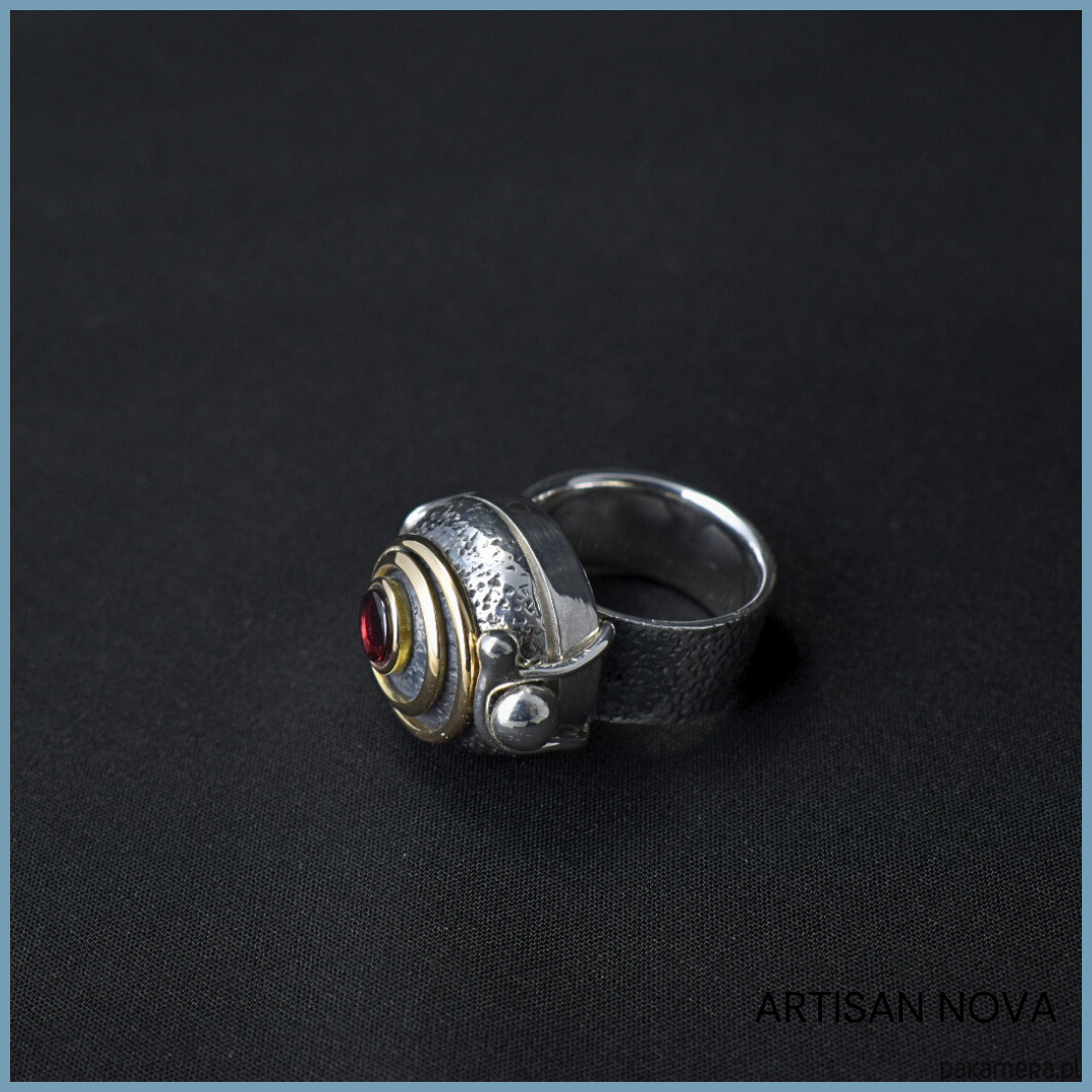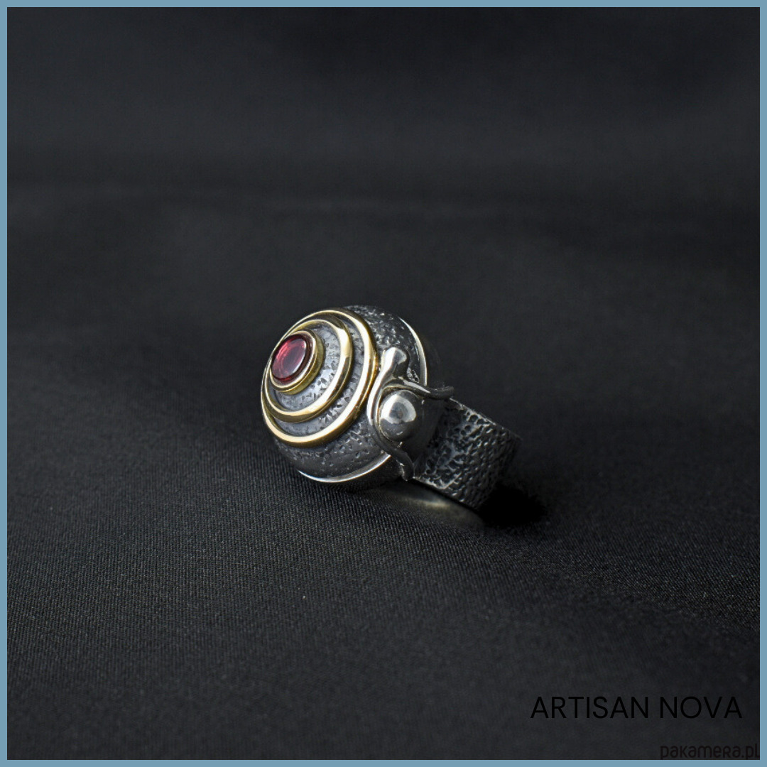 Pierścionek osadzony jest na szerokiej, fakturowanej obrączce, która zapewnia stabilność i ponadczasowy styl. Natomiast góra pierścionka to półkula, która również posiada fakturowaną, oksydowaną powierzchnię wykończoną w połysku. Geometryczny projekt uzupełniono kręgami ze złota próby 585, co dodaje całości luksusowego charakteru. W centrum kompozycji dumnie prezentuje się granat rodolit klasy AA, który został również oprawiony w złoto.