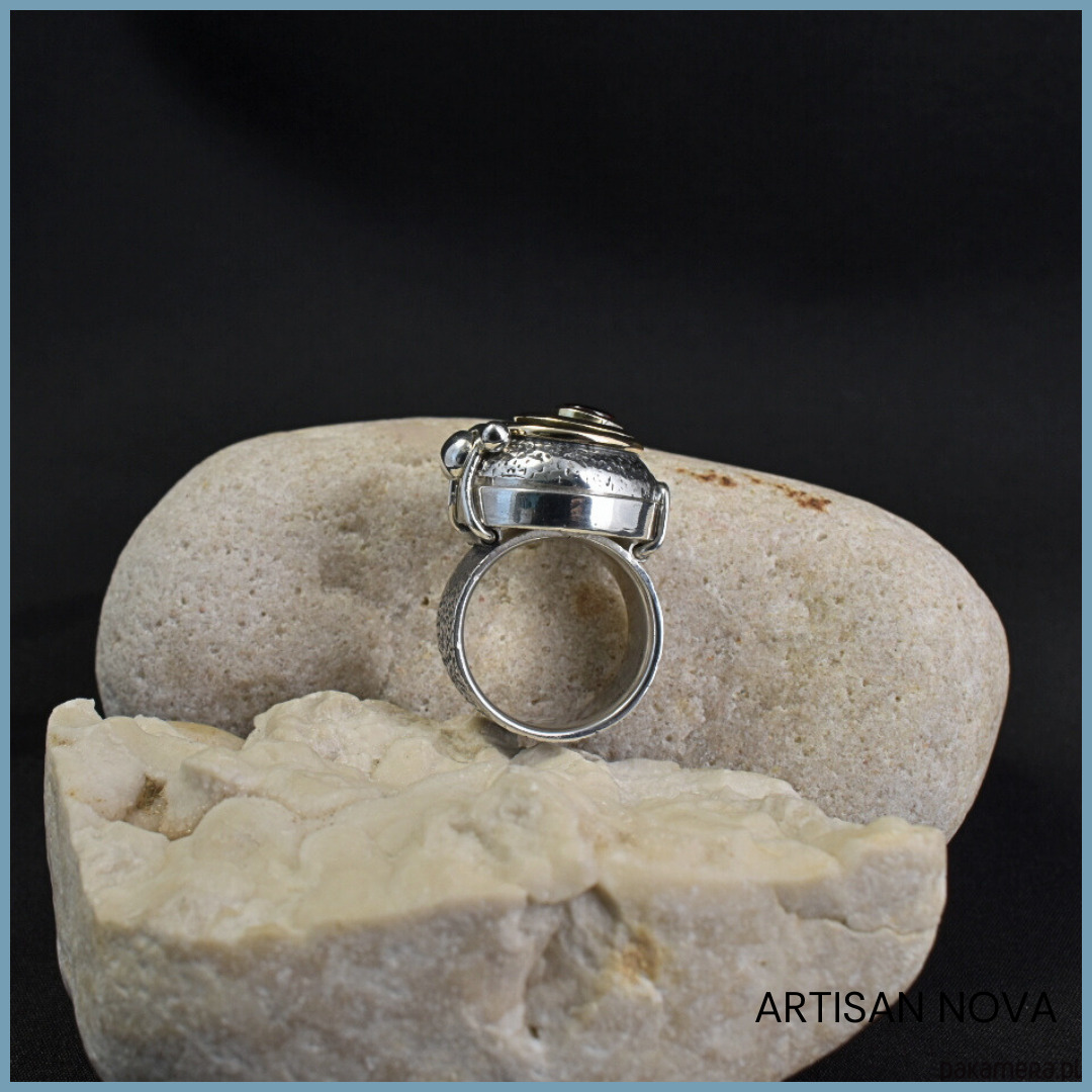 Ten duży, przyciągający wzrok unikat łączy w sobie surowość srebra, blask złota oraz głębię kamienia naturalnego. Jest stworzony dla kobiet, które cenią ręcznie robioną biżuterię srebrną i nie boją się wyrazistego stylu.