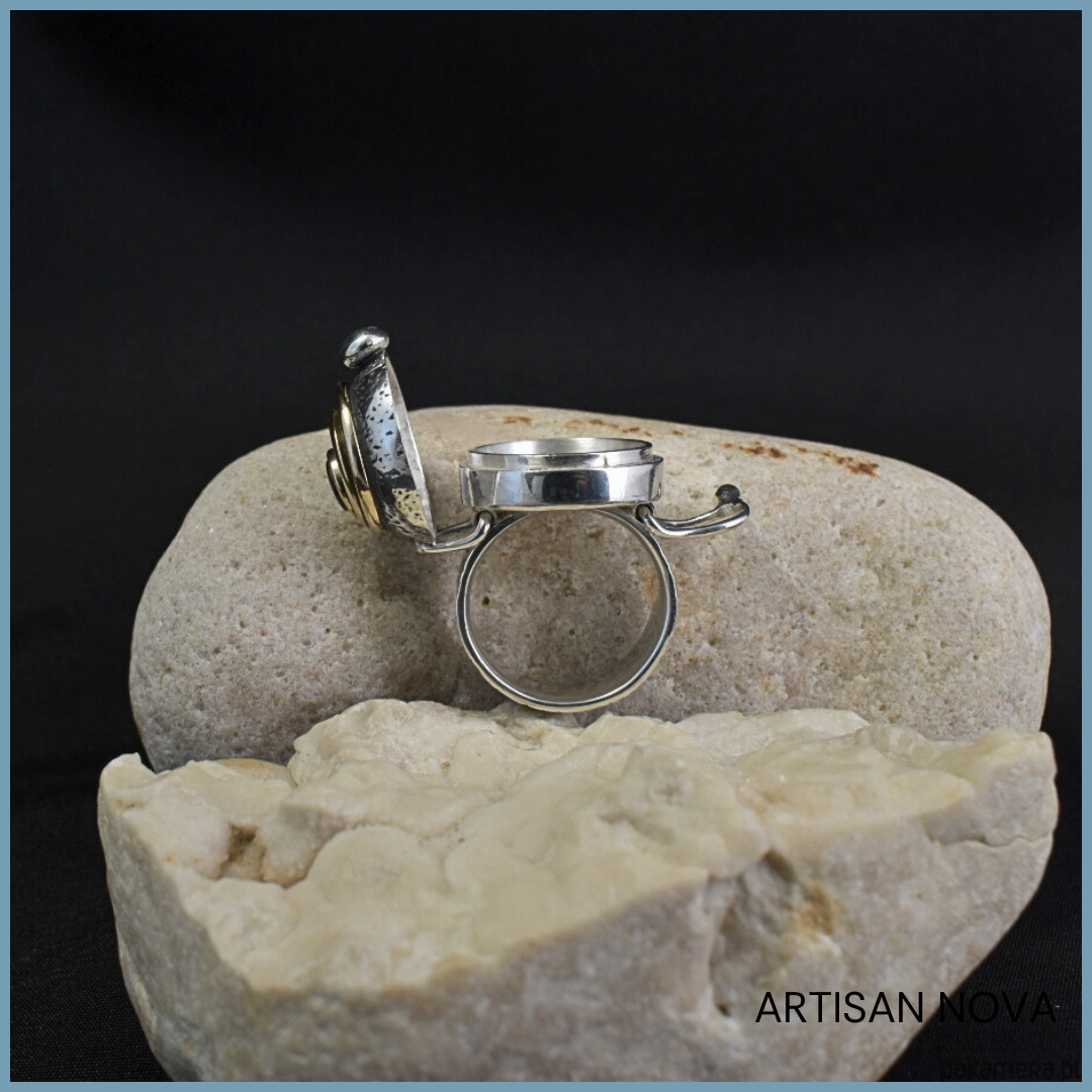 Ten ręcznie wykonany, otwierany pierścionek sekretnik jest wyrazem odważnego, awangardowego stylu i piękna rzemiosła. Służy nie tylko jako biżuteria, ale również jako dyskretne miejsce, w którym można ukryć zdjęcie bliskiej osoby lub cenny, drobny przedmiot.