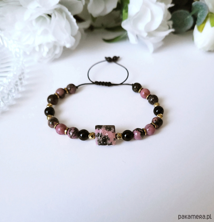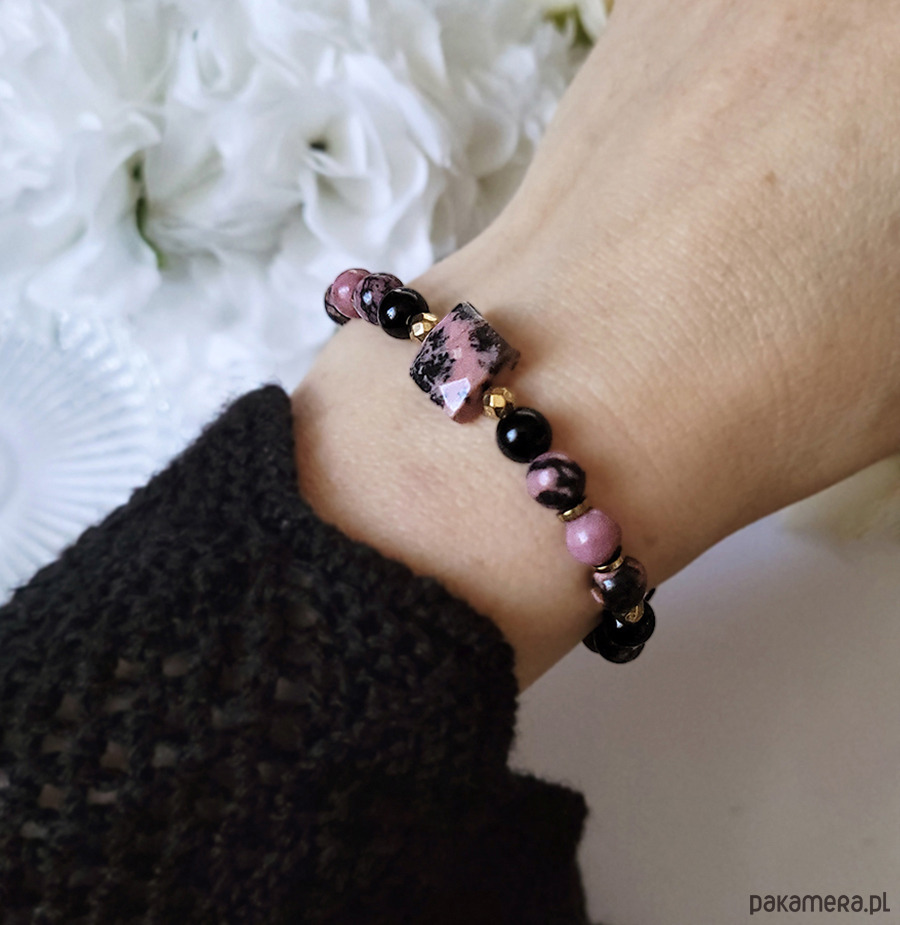 JEDYNA SZTUKA- Bransoletka zrobiona z kamieni naturalnych: Rodonitu, Onyksu oraz Hematytu w kolorze złota.