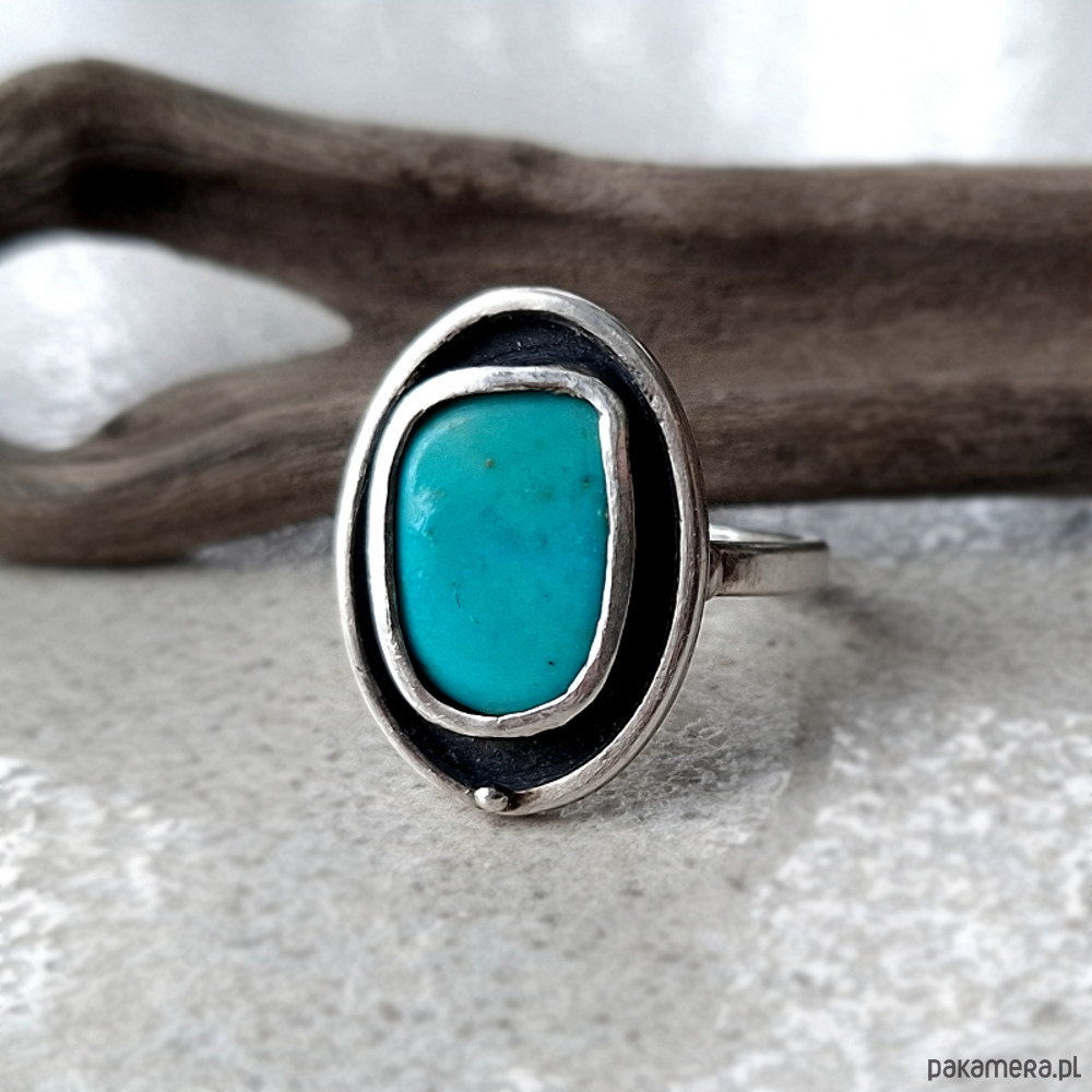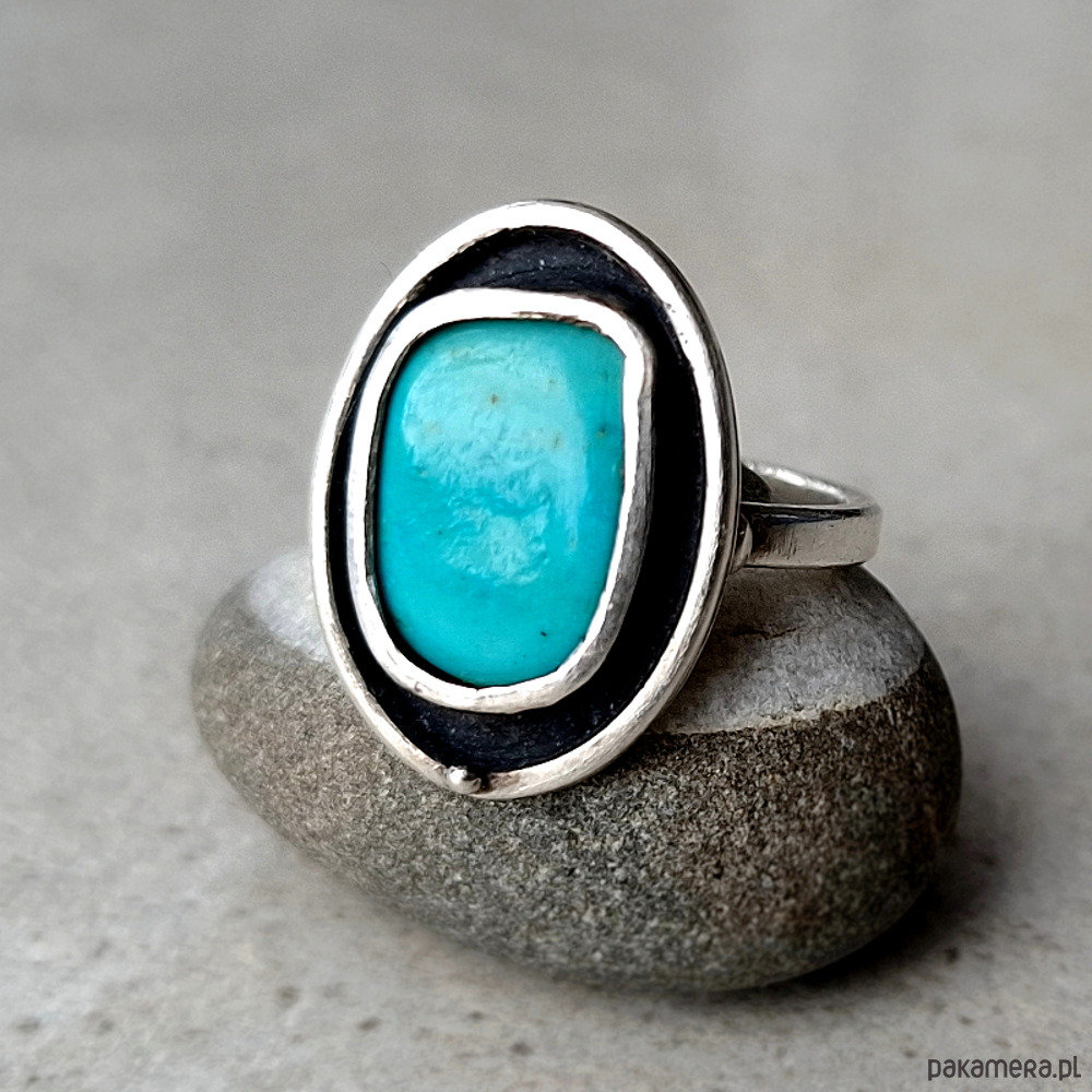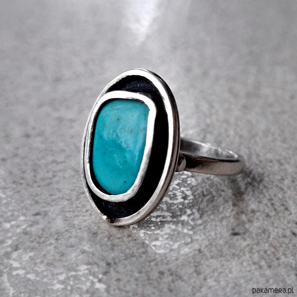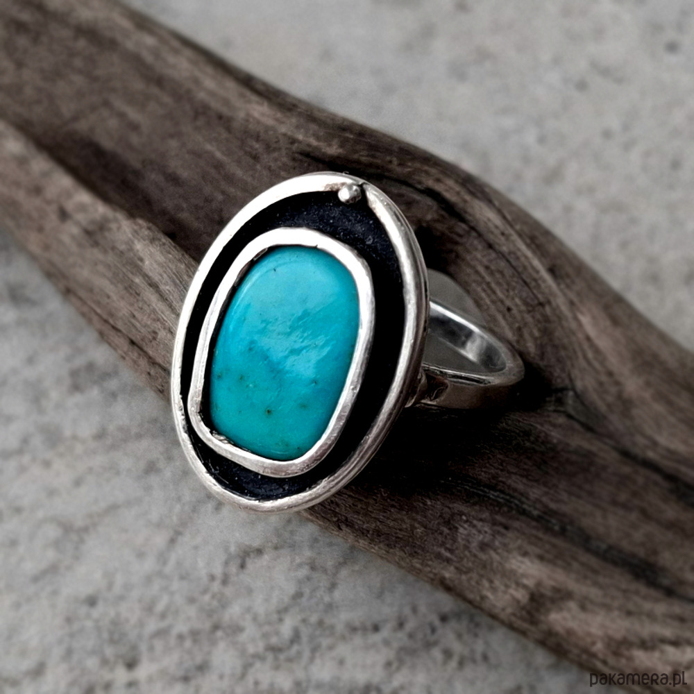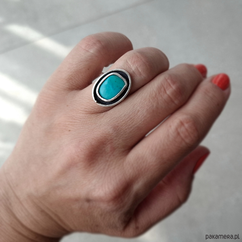 Okazały etniczny, srebrny pierścień ozdobiony intensywnie błękitnym turkusem Arizona. Owalna korona pierścionka została ozdobiona naturalnym turkusem. Całość wykonana ręcznie ze srebra, 930, 925 w jednym niepowtarzalnym egzemplarzu. Wymiary korony pierścionka: ok 14x20 mm, rozmiar turkusu ok 8x12 mm. Rozmiar obrączki 13. Biżuteria zostanie ozdobnie zapakowana.