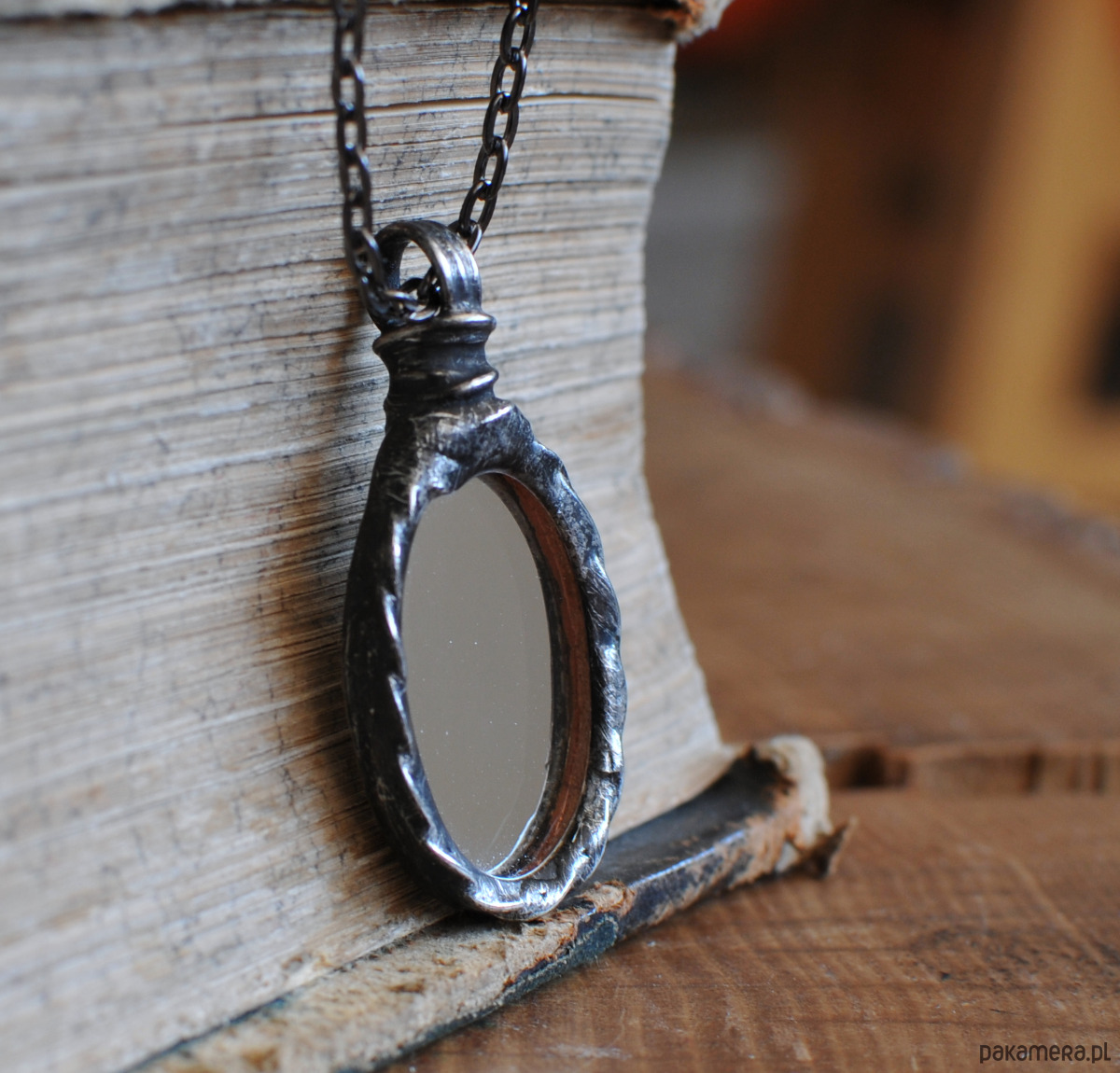 Delikatny, a jednocześnie wyrazisty naszyjnik z prawdziwym, szklanym lusterkiem w kształcie portalu – u góry łuk, u dołu prostokątne wykończenie. Lusterko oprawione jest w ręcznie wykonaną, artystyczną ramę stylizowaną na stare srebro, co nadaje mu niepowtarzalnego charakteru.