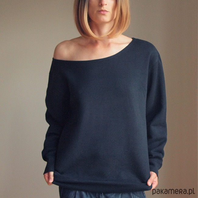 Dekolt w łódkę, podszyty, rękawy i dół bluzy ze ściągaczami.