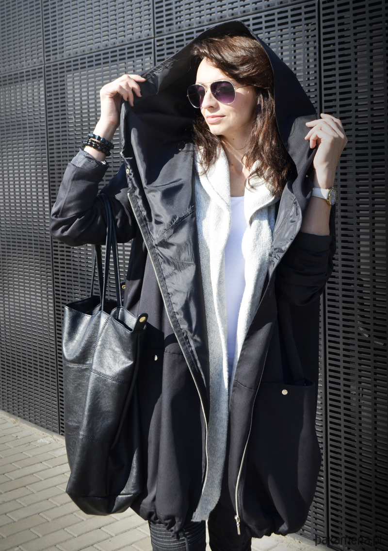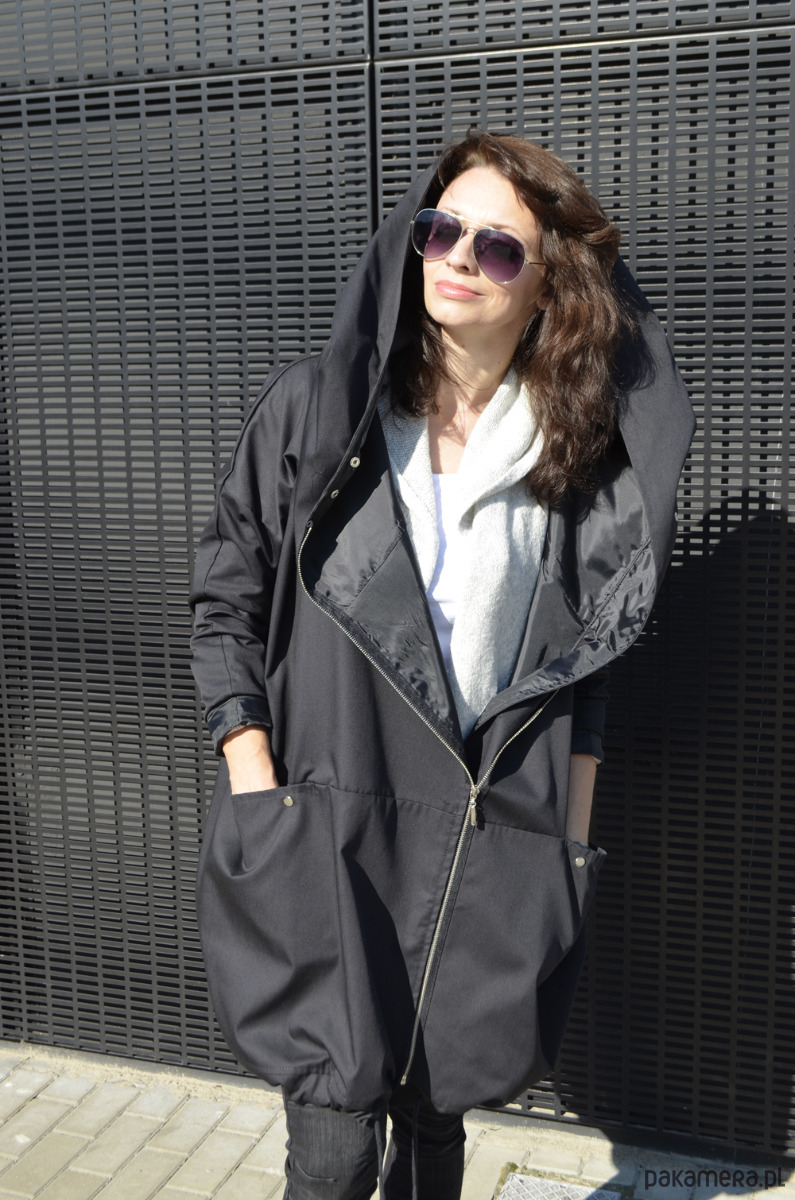 Płaszcz posiada ogromny kaptur oraz dwie pojemne kieszenie ozdobione napami,