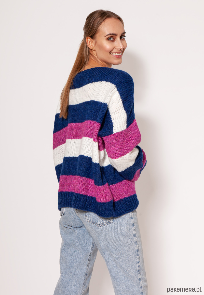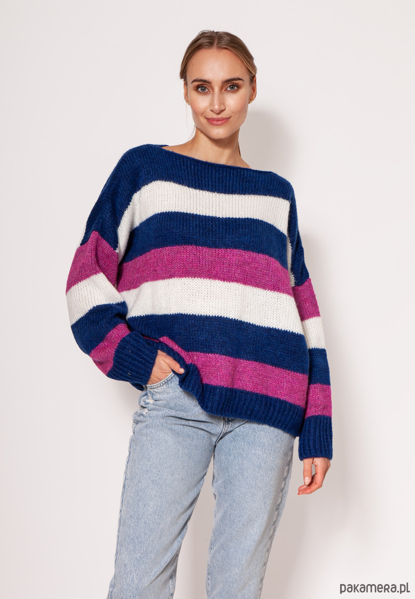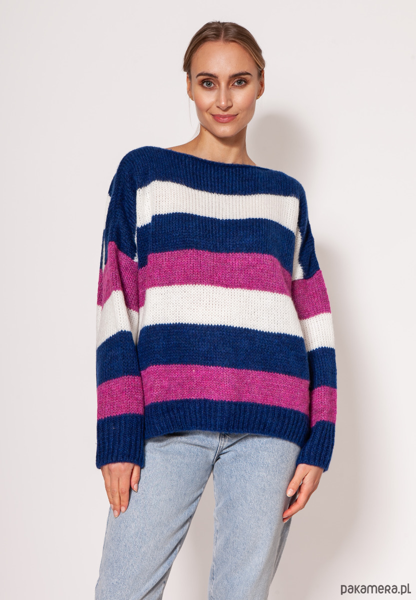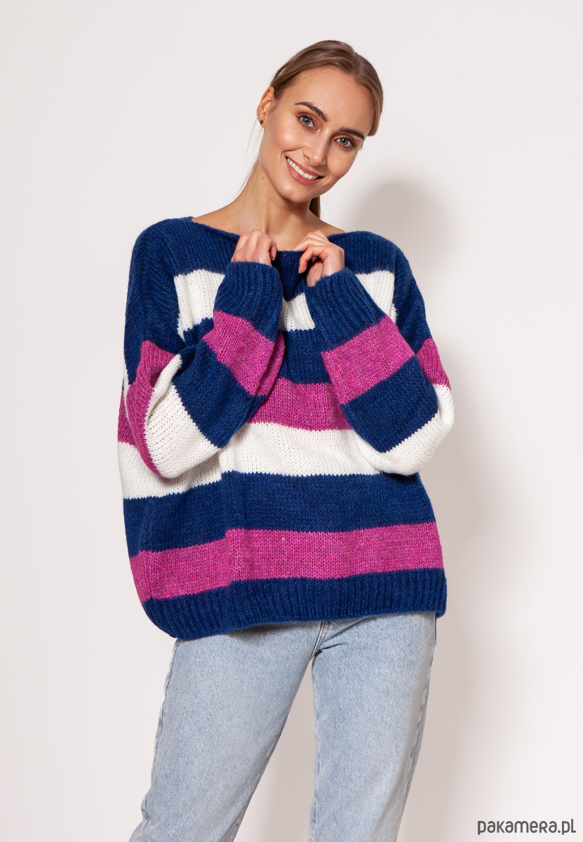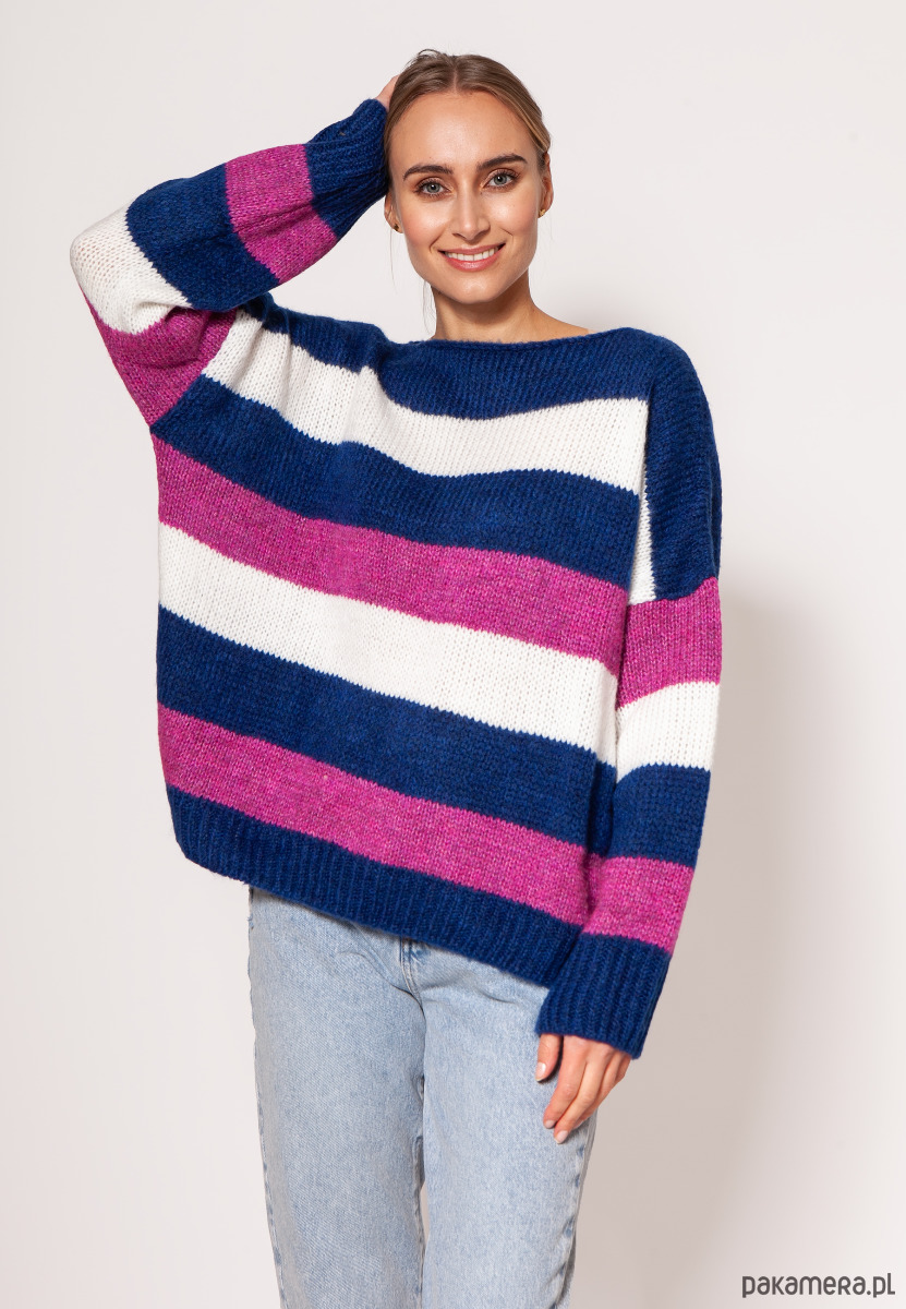 Oversize'owy sweter w paski - SWE299 kobalt/róż/ecru MKM