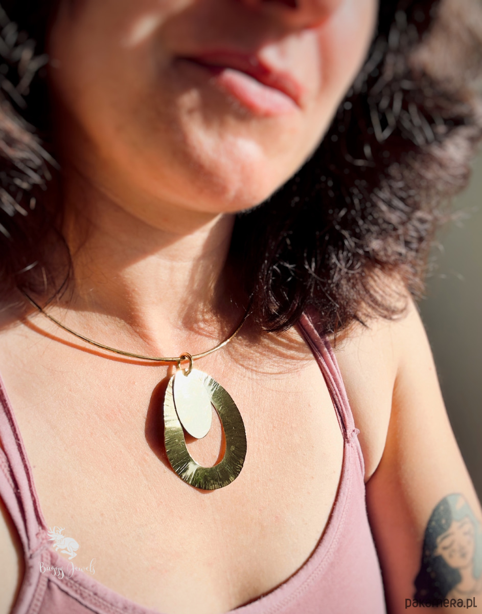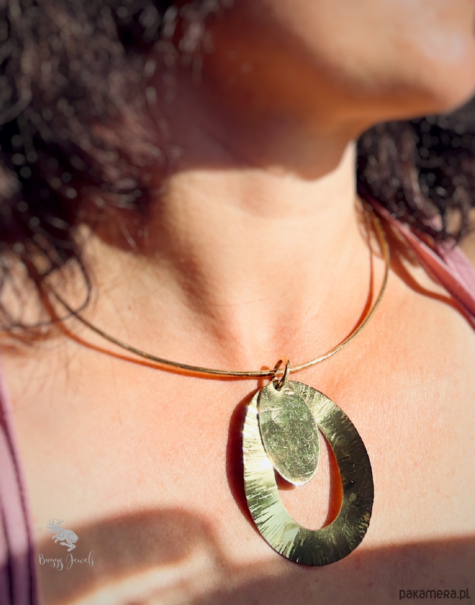 "Owalna Ekspresja" to naszyjnik o prostej, ale niebanalnej formie. Mosiężna obręcz z delikatnym przedłużeniem o długości około 3 cm subtelnie otula szczupłą szyję, nie dominując, a raczej stanowiąc niezwykle stylowy akcent każdej kreacji. To, co jednak wyróżnia ten naszyjnik, to wisiorek w formie dwóch owalnych elementów - wzajemnie uzupełniających się i symbolizujących harmonię.