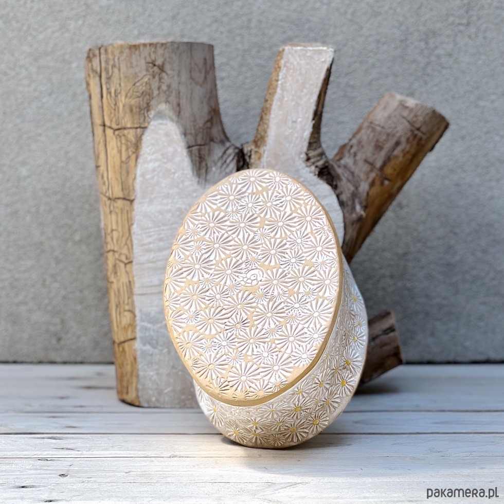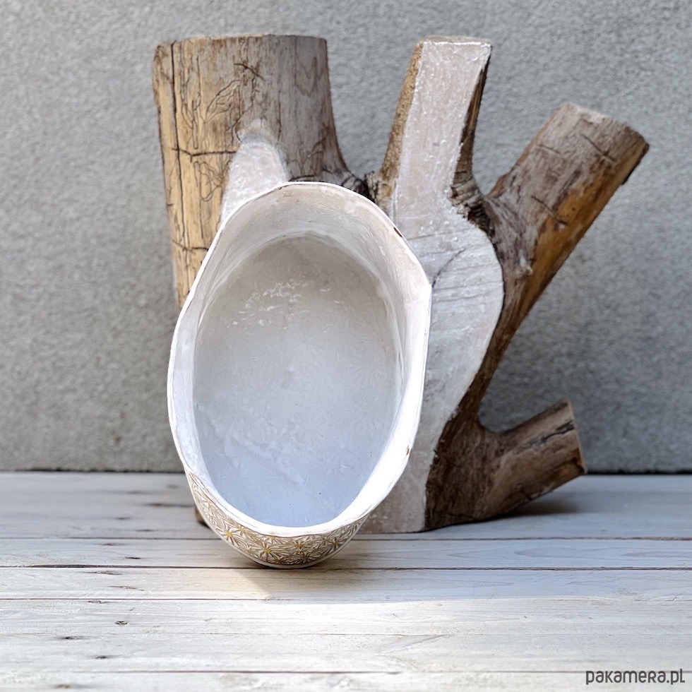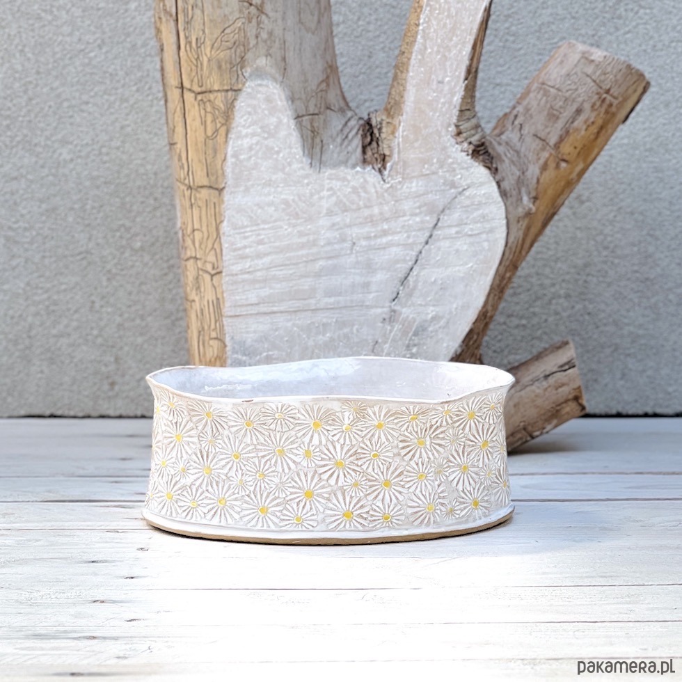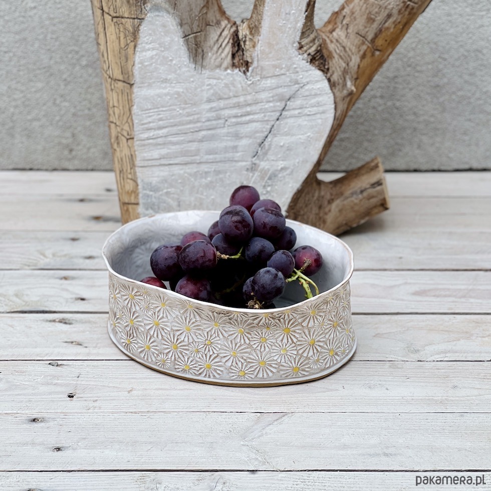Ręcznie wykonana ceramiczna misa na owoce z wysoką burtą ozdobioną odciśniętym kwiatowym motywem stokrotek. Spód ma odciśnięty ten sam wzór tylko przetarty. Misa ma owalny kształt i organicznie falujące wykończenie miejscami przetarte co nadaje wygląd lekko vintage. Naczynie nadaje się do serwowania zimnych i gorących dań. Idealna do bigosu lub sałatki jarzynowej. Będzie ciekawym prezentem dla osoby ceniącej ręcznie wykonaną ceramikę.
