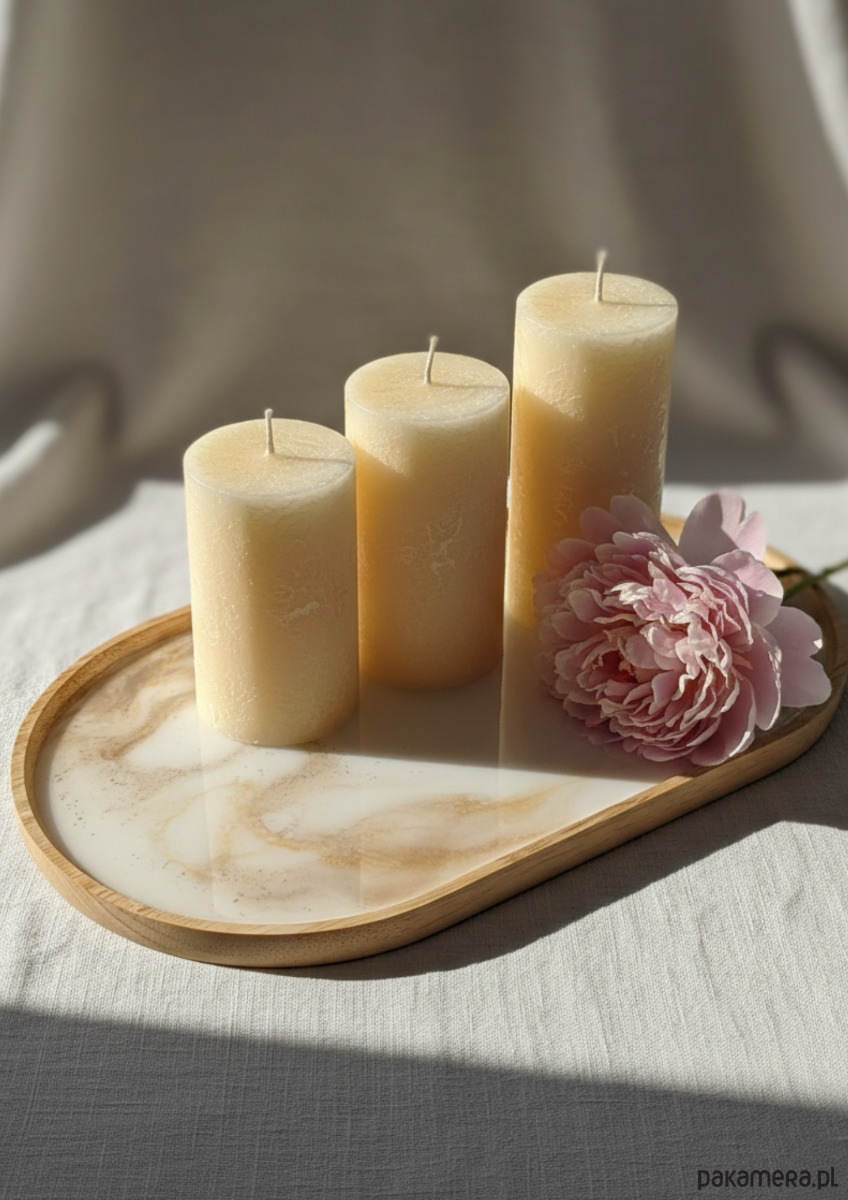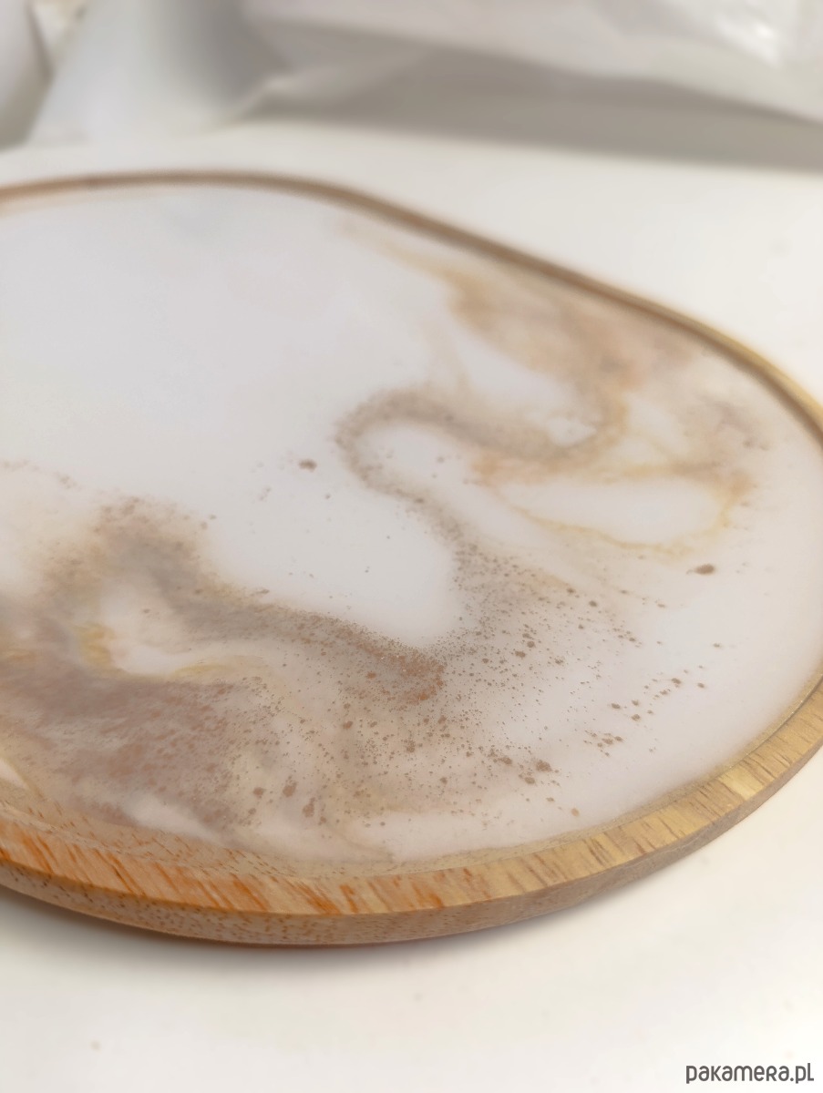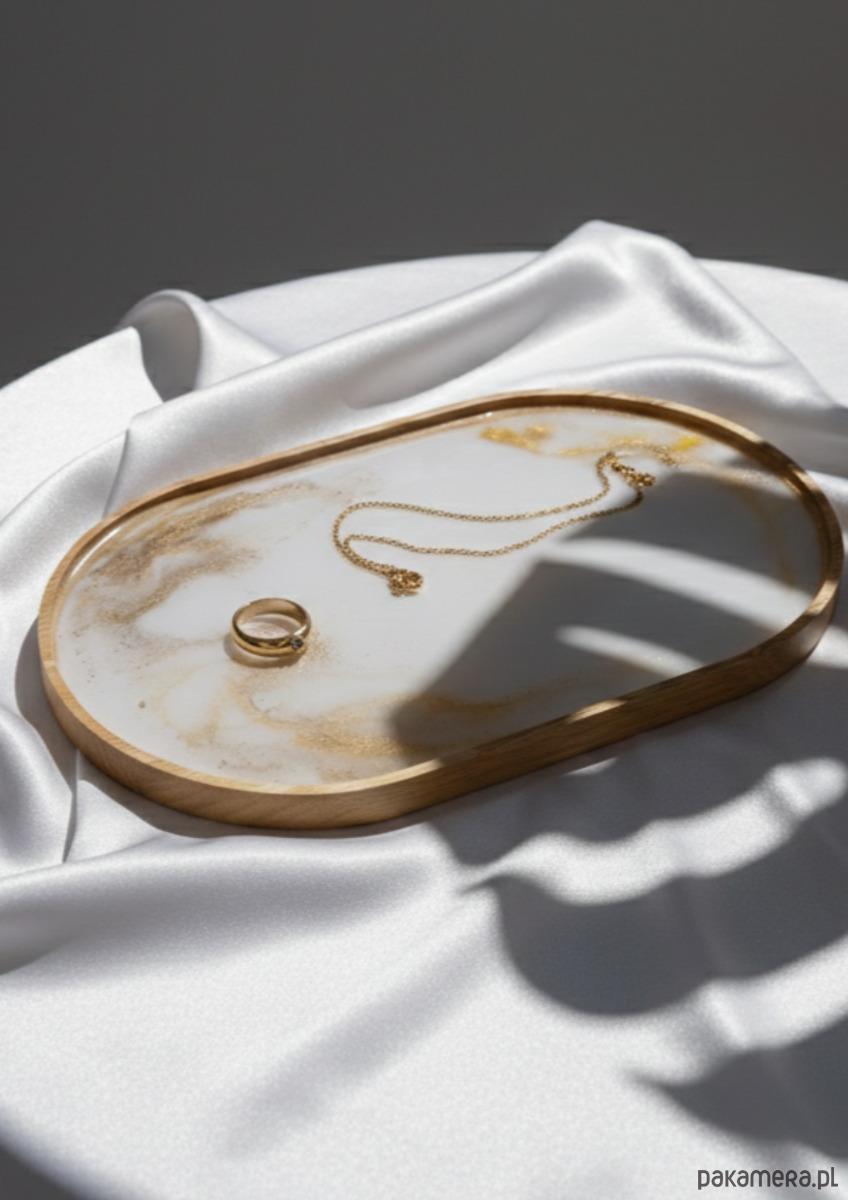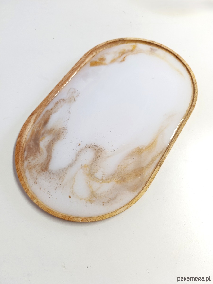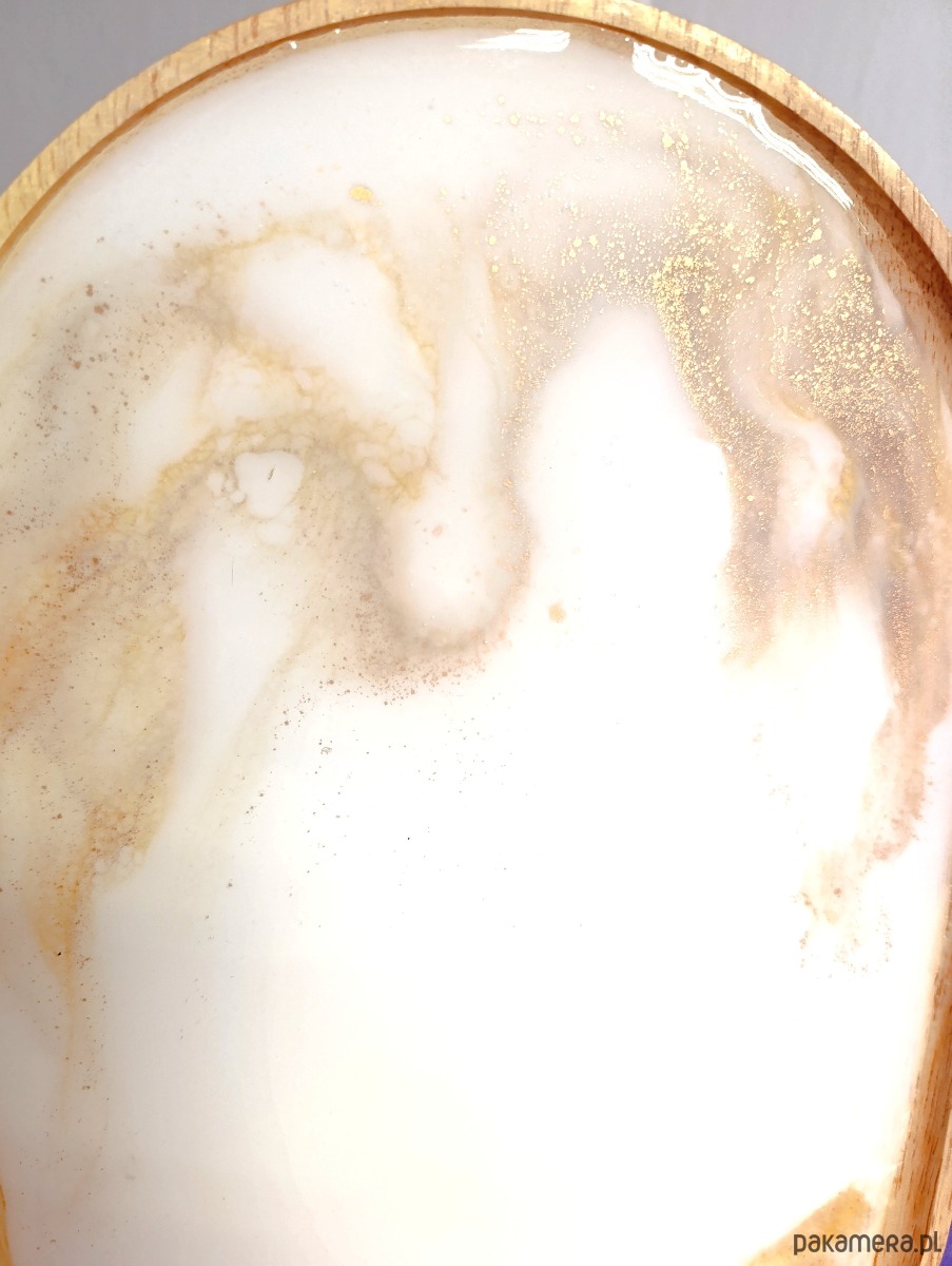 Elegancka, ręcznie wykonana taca dekoracyjna z żywicy epoksydowej o wymiarach 40×25×1,5 cm. Połączenie czystej bieli z subtelnymi złoto brązowymi pigmentami tworzy unikatowy, marblowy efekt, który pięknie odbija światło i nadaje wnętrzu luksusowego charakteru. Każdy egzemplarz jest tworzony ręcznie, dlatego wzór żywicy jest jedyny w swoim rodzaju.