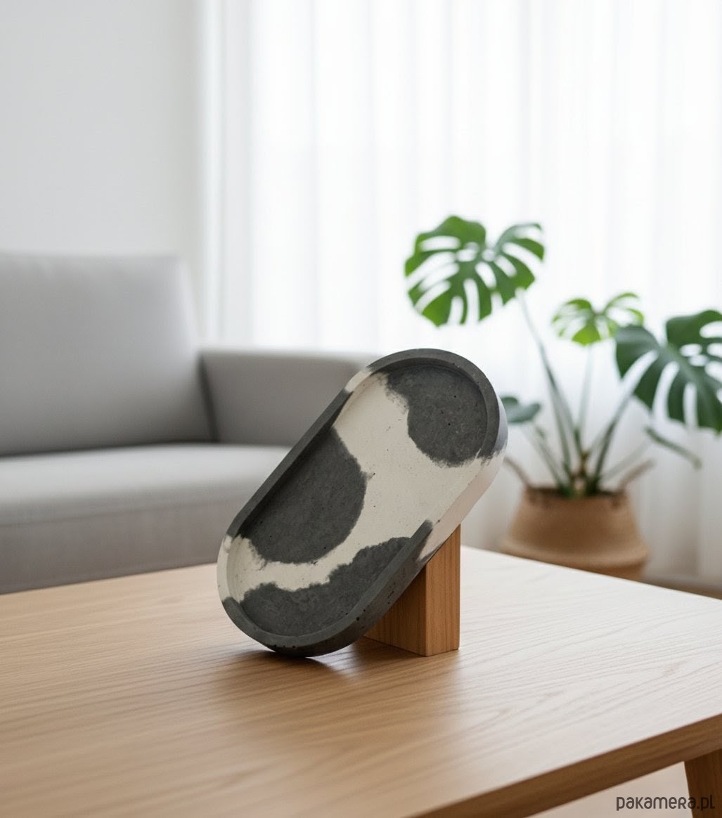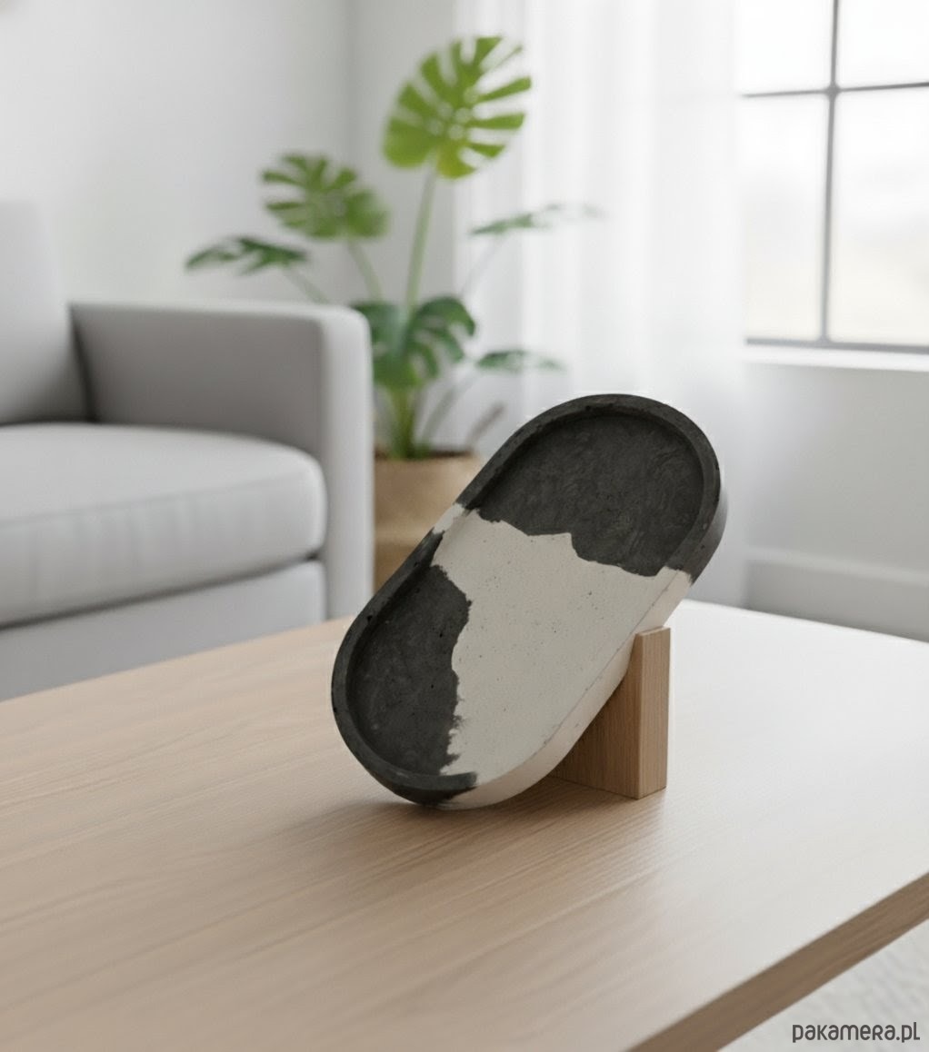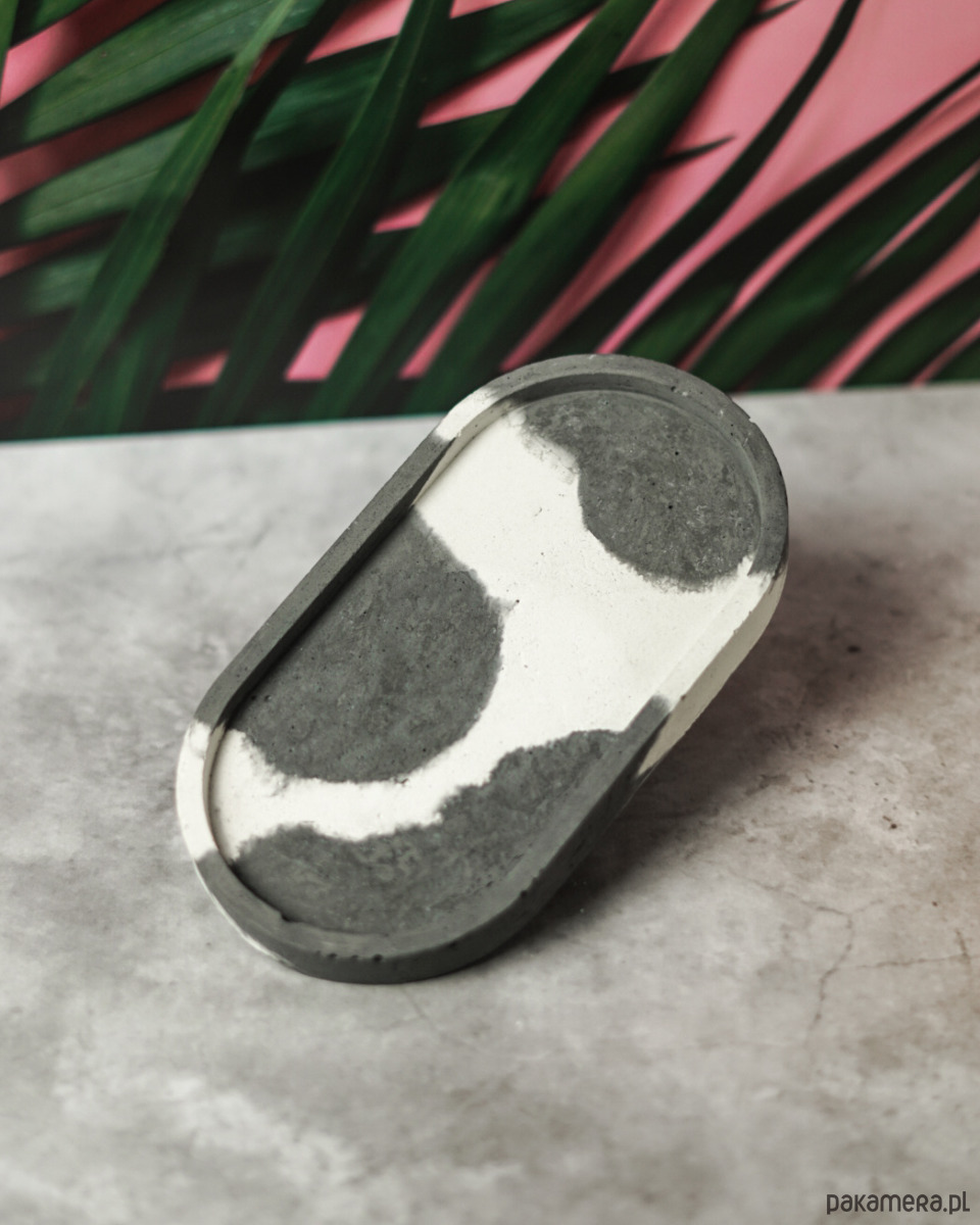 Ręcznie robione owalne podkładki, które można wykorzystać jako organizer na biżuterię lub osłonki na podgrzewacze lub mini rośliny w kolorze grafitowo białym. Odpowiednie proporcje cementu i dodatków pozwoliły uzyskać idealny kolor, a zarazem wytrzymałość. Proces obróbki wykonywany jest ręcznie, bez wykorzystania maszyn. Produkt jest zabezpieczony specjalną mieszanką nadającą wytrzymałość, a na samym końcu specjalnym lakierem. Każdy nasz produkt jest inny, nie jest produkowany seryjnie, co nadaje mu niepowtarzalność.