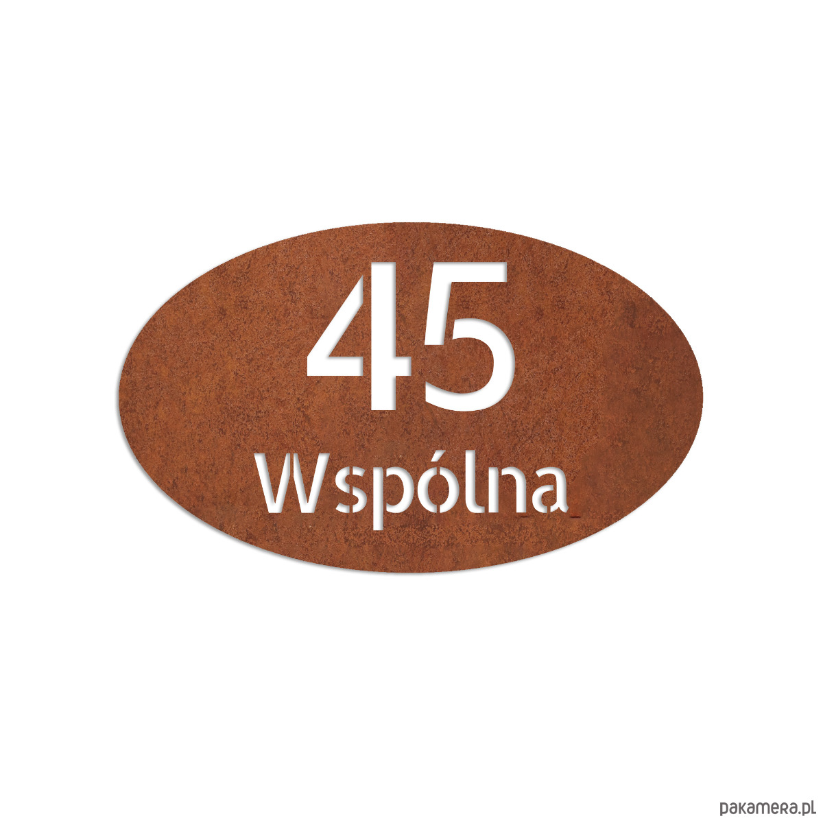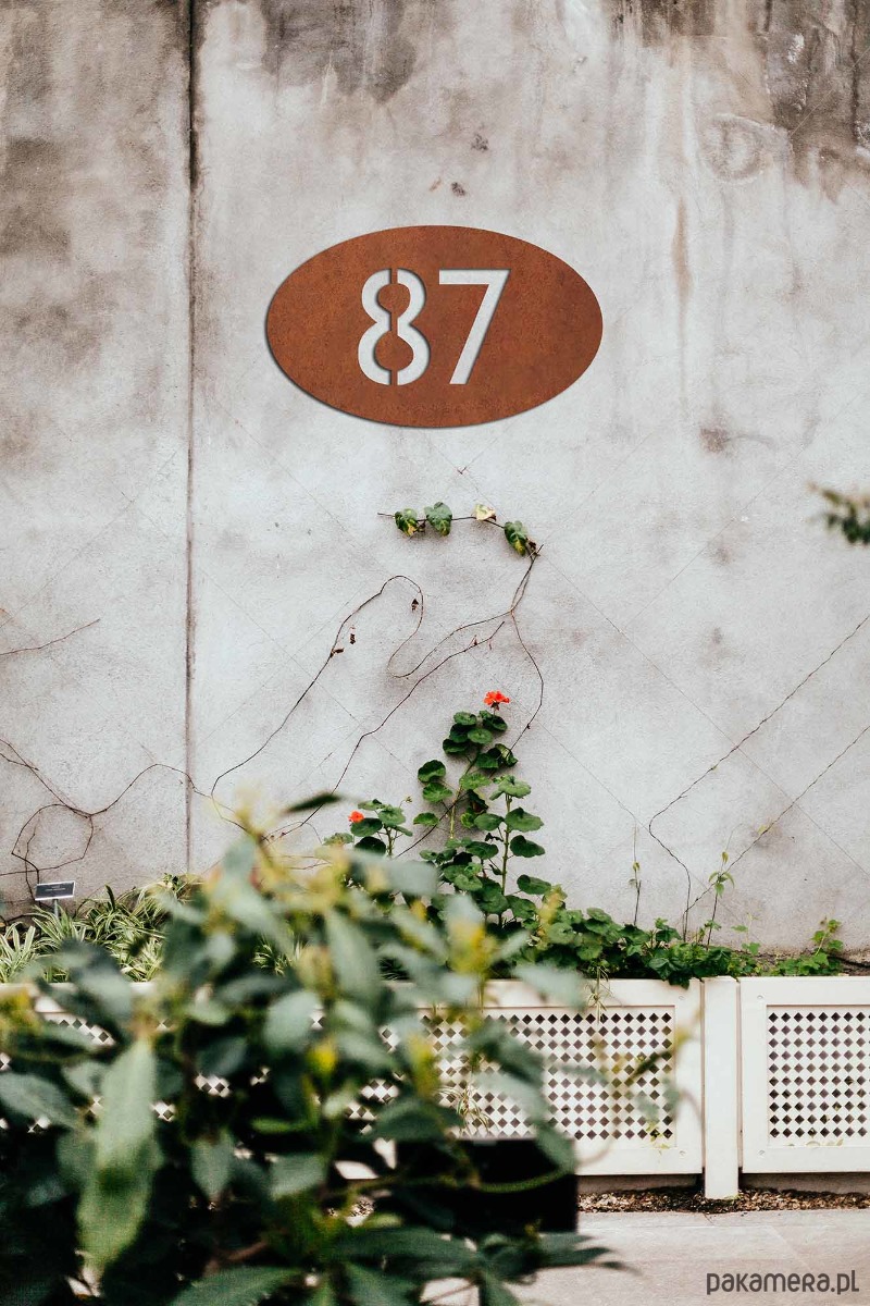 Owalna tablica adresowa, szyld, numer domu wykonany ze stali corten która jest pokryta naturalną rdzą i jest odporna na warunki atmosferyczne.