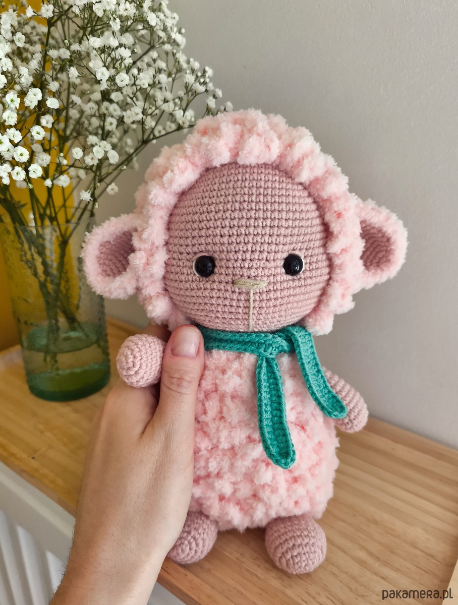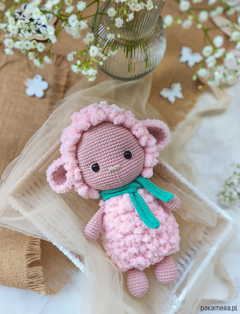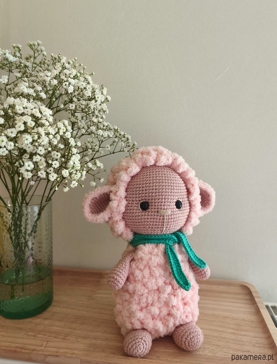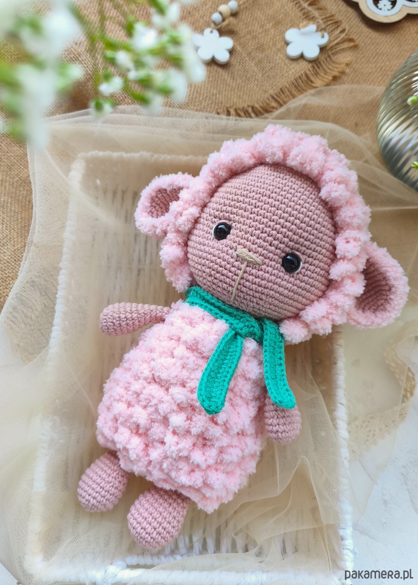 Pluszowa owieczka wykonana z półbawełnianej i pluszowej futrzanej włóczek, które posiadają Certyfikat Oeko-Tex.