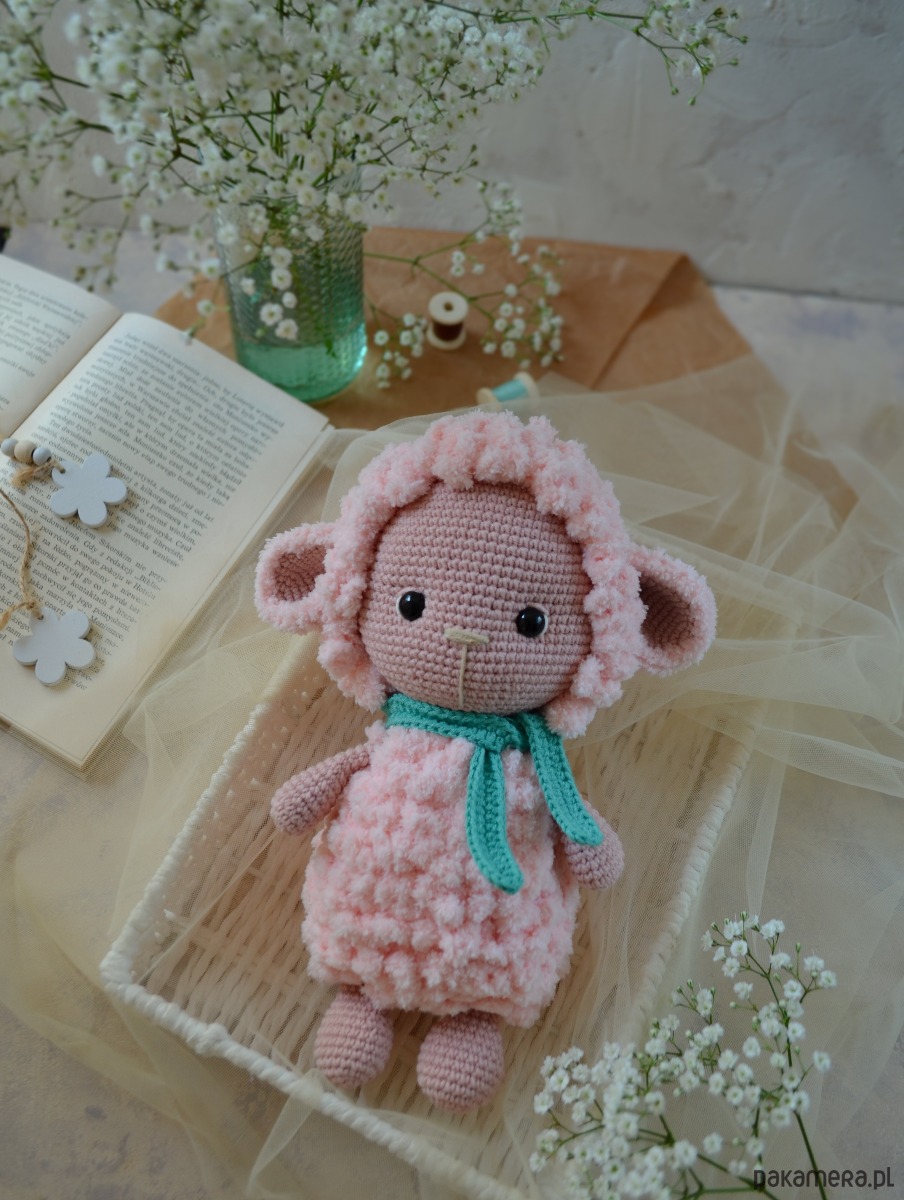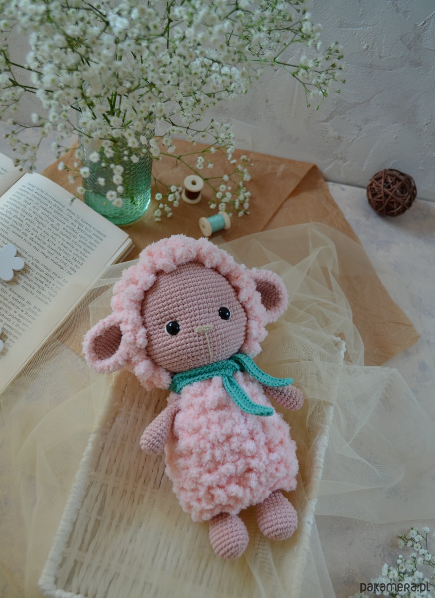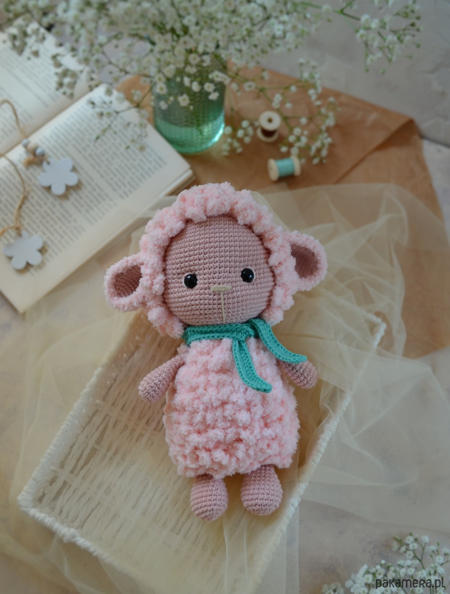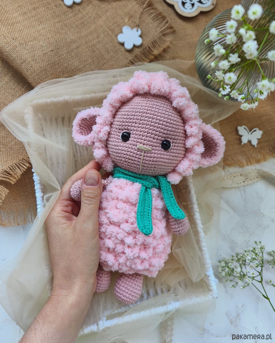 Pluszowa owieczka wykonana z półbawełnianej i pluszowej futrzanej włóczek, które posiadają Certyfikat Oeko-Tex.