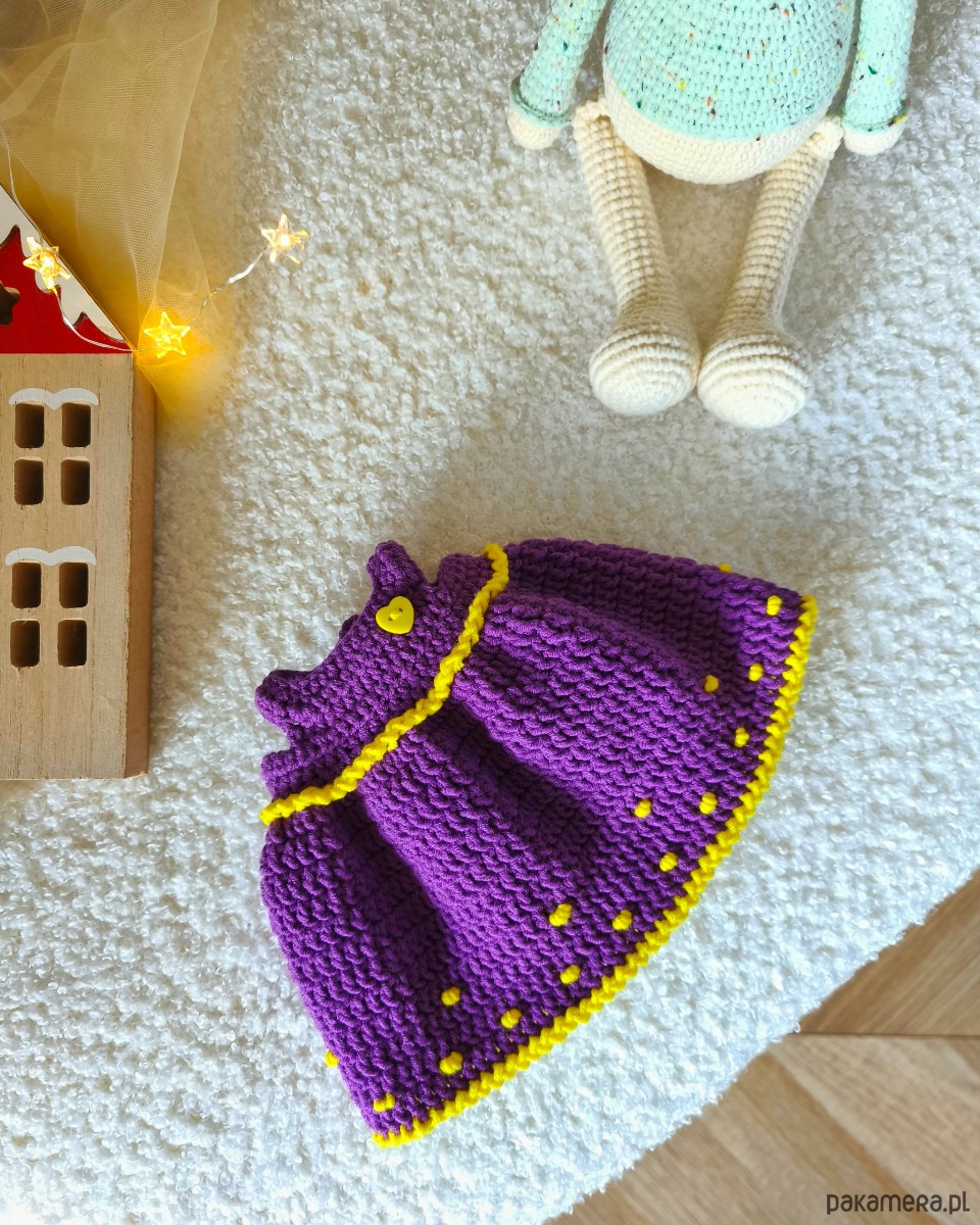 - Sukienka wykonana jest w kolorze ciemnym fioletowym z akcentami nasączonego żółtego koloru. Zapinana jest na plastikowe żółte guziki. Sukienka jest zdejmowana.