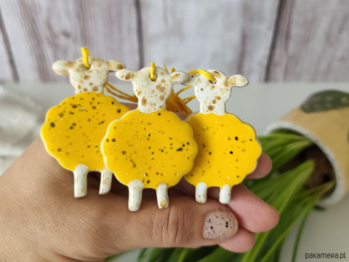 Uroczy zestaw trzech ceramicznych zawieszek w kształcie owieczek. Te ceramiczne ozdoby wielkanocne i na naturalnym sznurku dodadzą przytulności każdemu wnętrzu i idealnie sprawdzą się jako dekoracja gałązek bazi lub element wielkanocnego stroika.