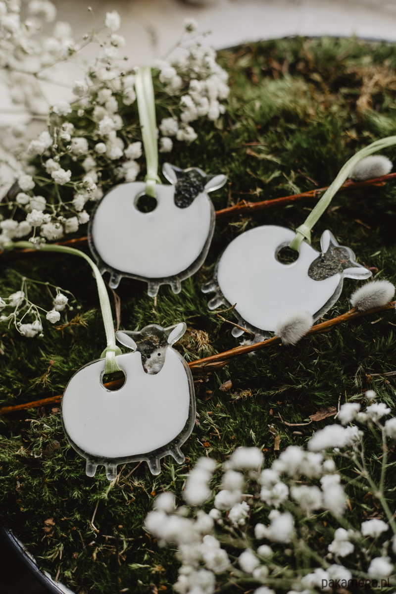 Ozdoby zawieszone są na satynowych tasiemkach. Jeśli chcesz aby ozdoby zawieszone były na wstążce innego koloru (różowa lub niebieska)- napisz do nas.