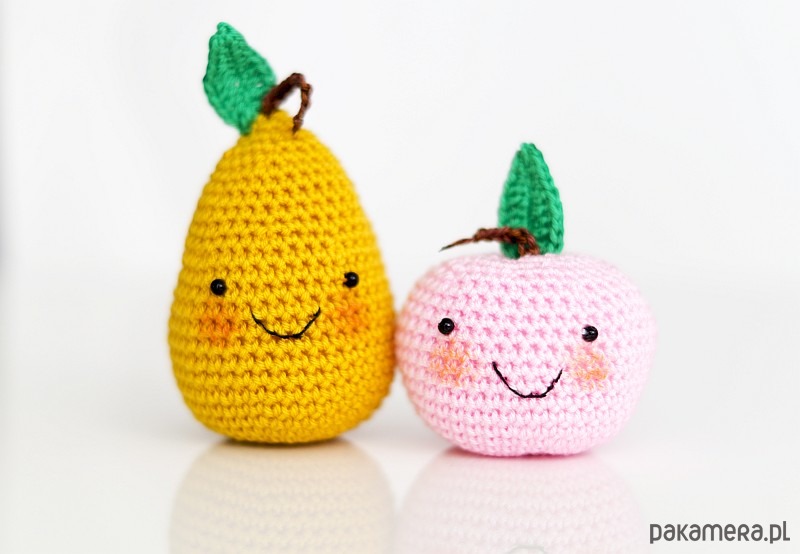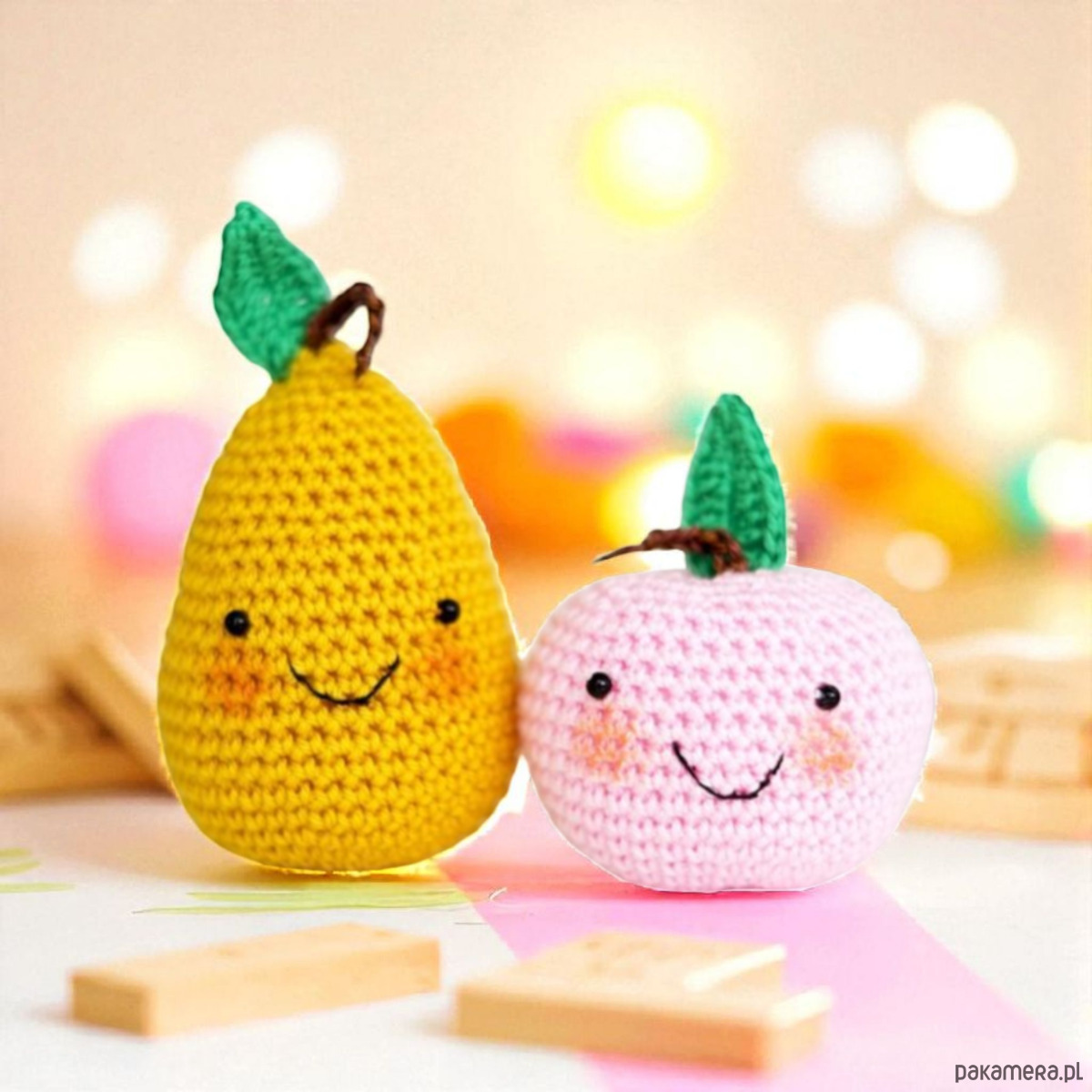 Dwie urocze, wyjątkowe owoce wykonane na szydełku z bawełnianej włóczki.