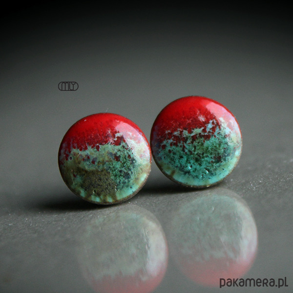 Okrągłe, lekko nieregularne ceramiczne kolczyki w formie sztyftów, ręcznie wykonane z delikatnej gliny kamionkowej, jednostronnie szkliwione mieszanką zielono czerwonych szkliw z efektem plamek i subtelnym połyskiem, na antyalergicznych sztyftach w kolorze srebrnym. Średnica ok.9mm.Polecam