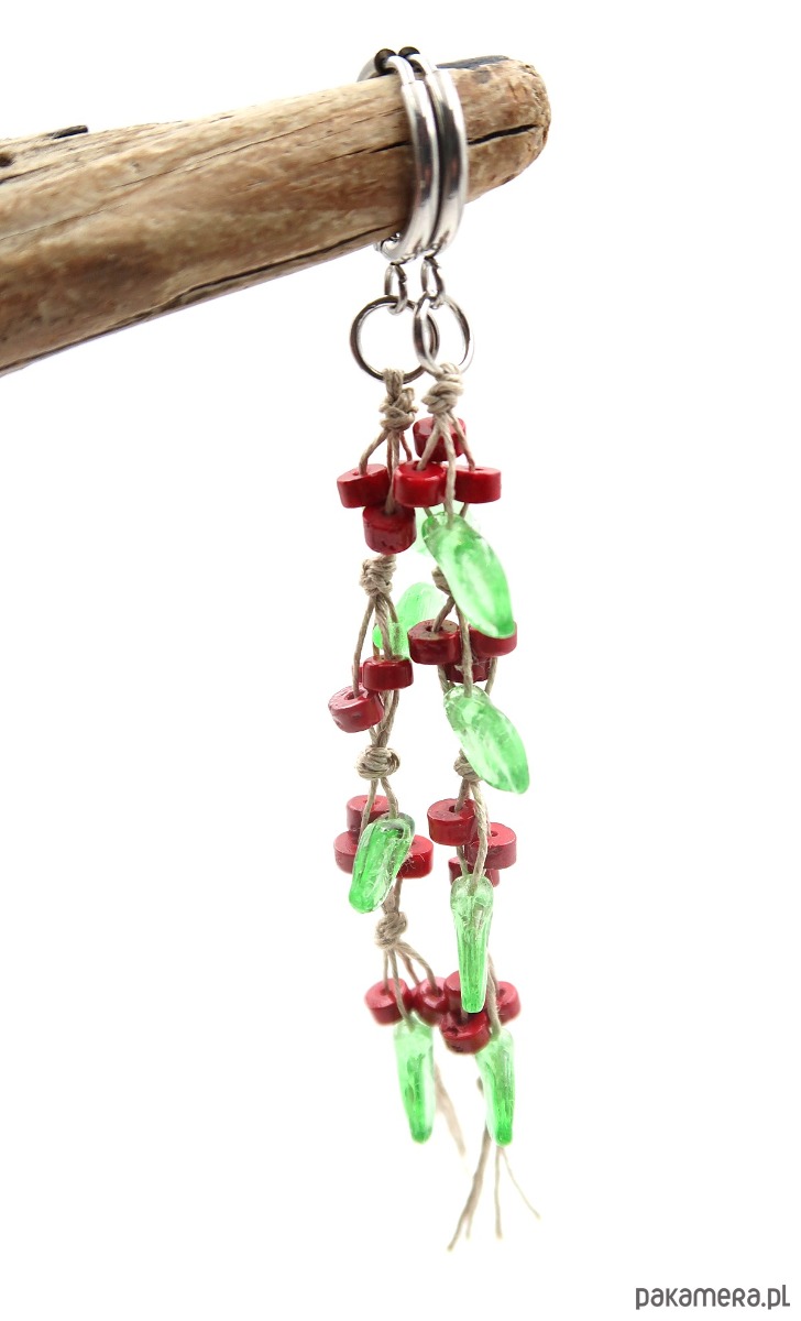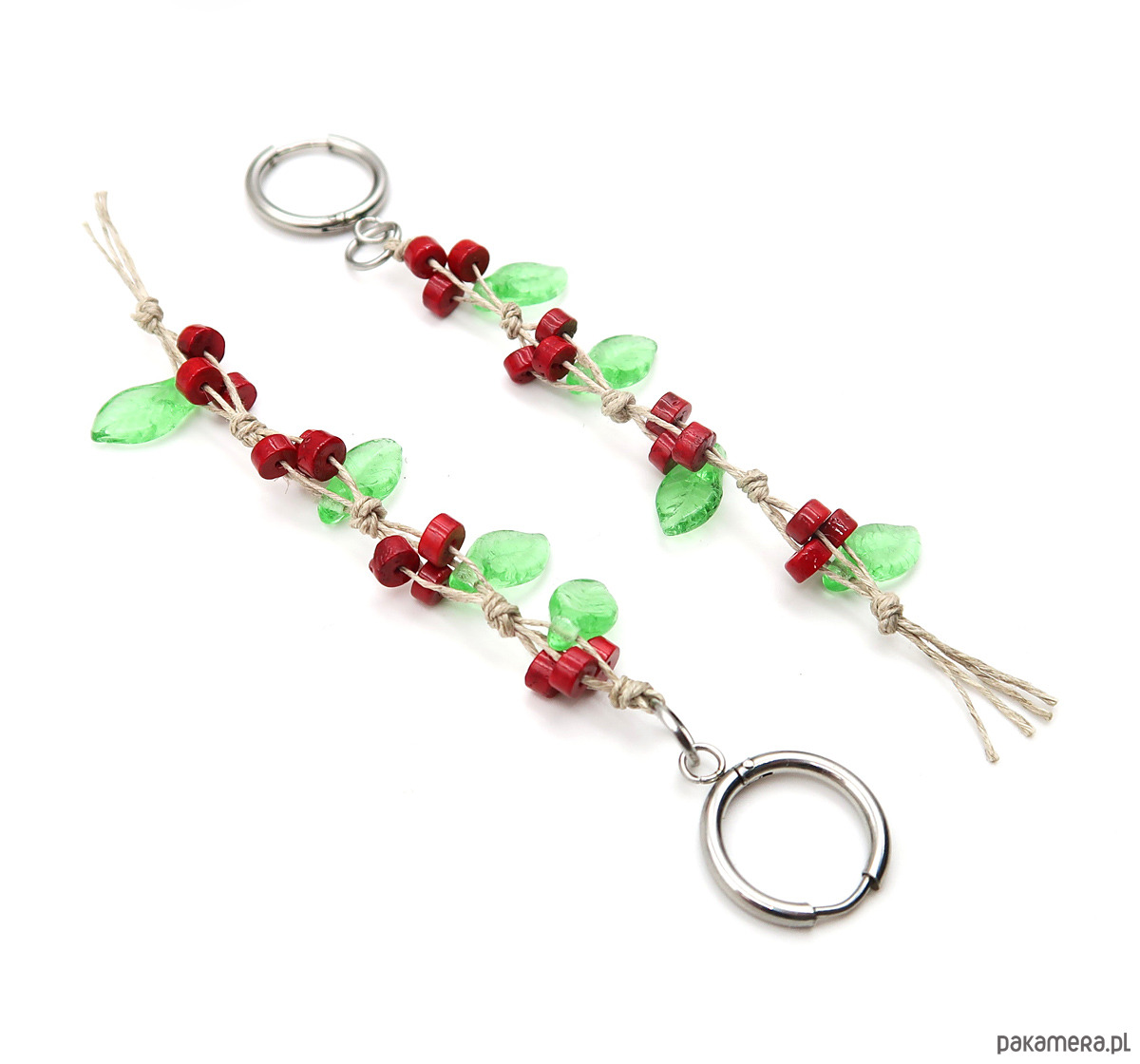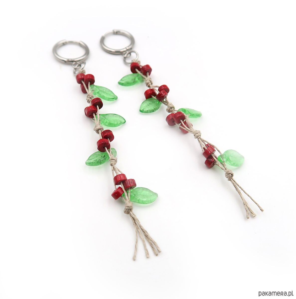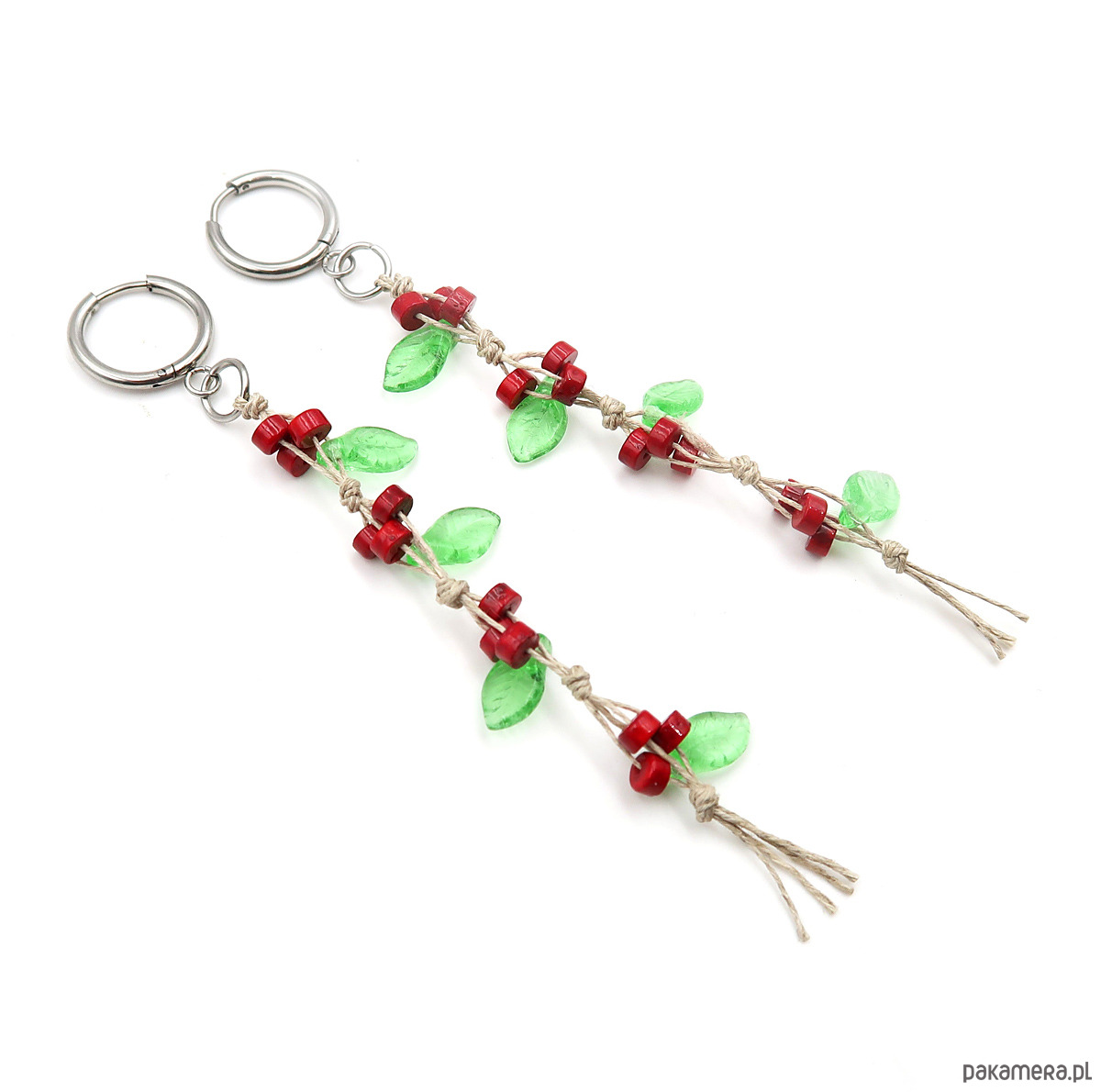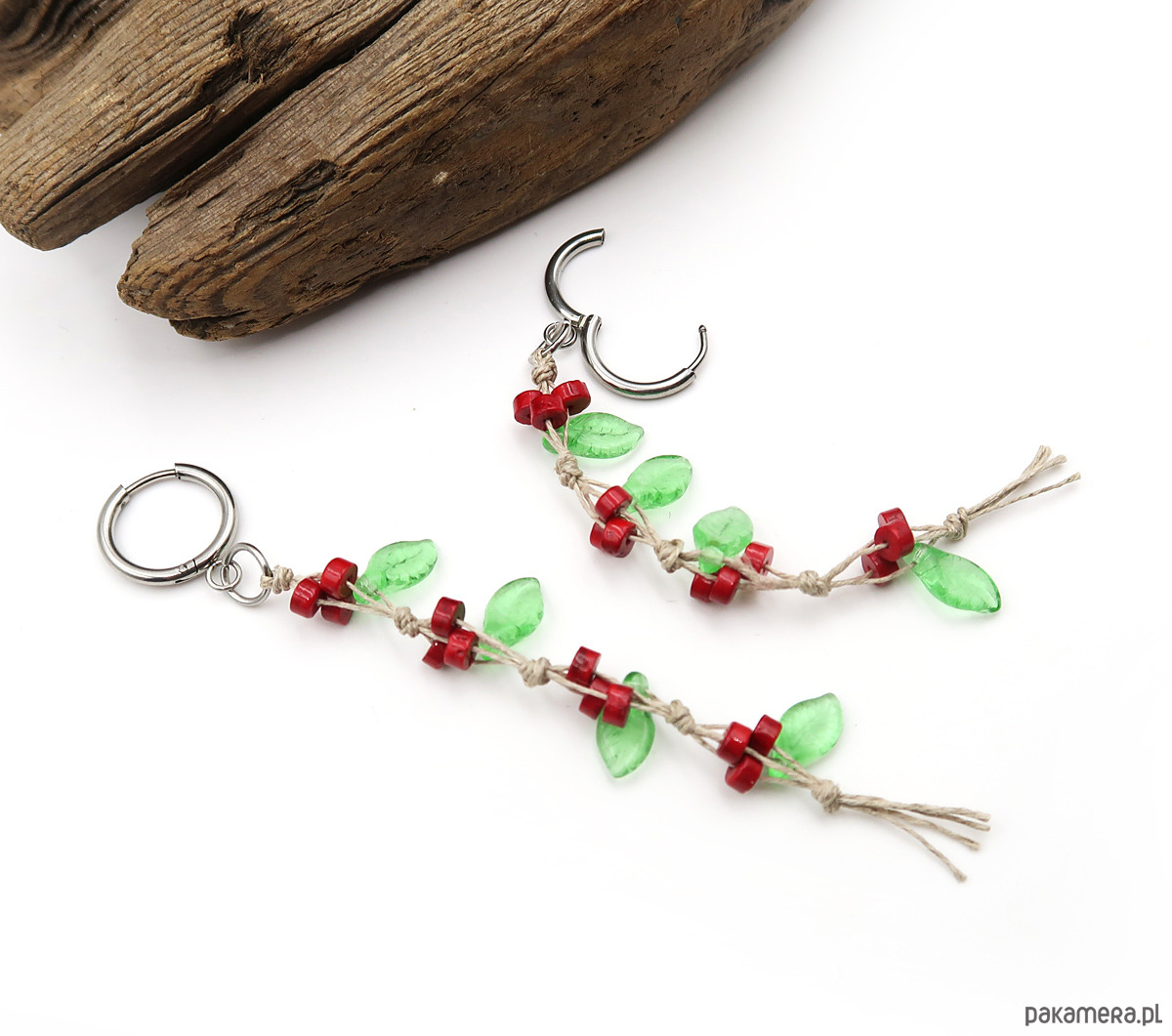Lekkie, zwiewne kolczyki wykonane z tych samych naturalnych materiałów co naszyjnik z kolekcji Owocowe Lato. Osadzone na polskiej przędzy lnianej, łączą w sobie soczyste odcienie czerwieni i delikatnej zieleni. W splocie wykorzystano naturalny koralowiec oraz czeskie szkło Jablonex, które subtelnie odbija światło i dodaje biżuterii letniej świeżości.