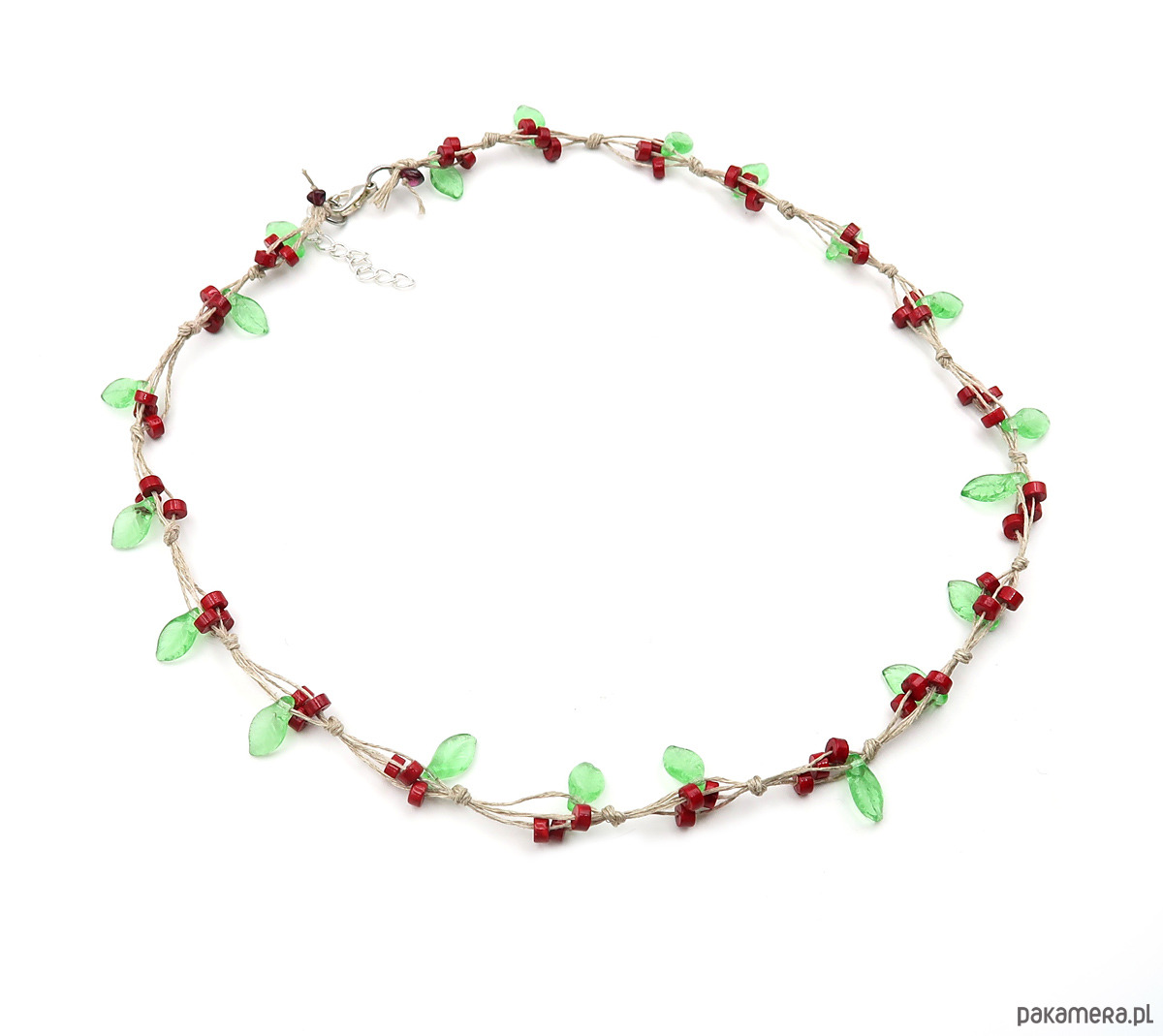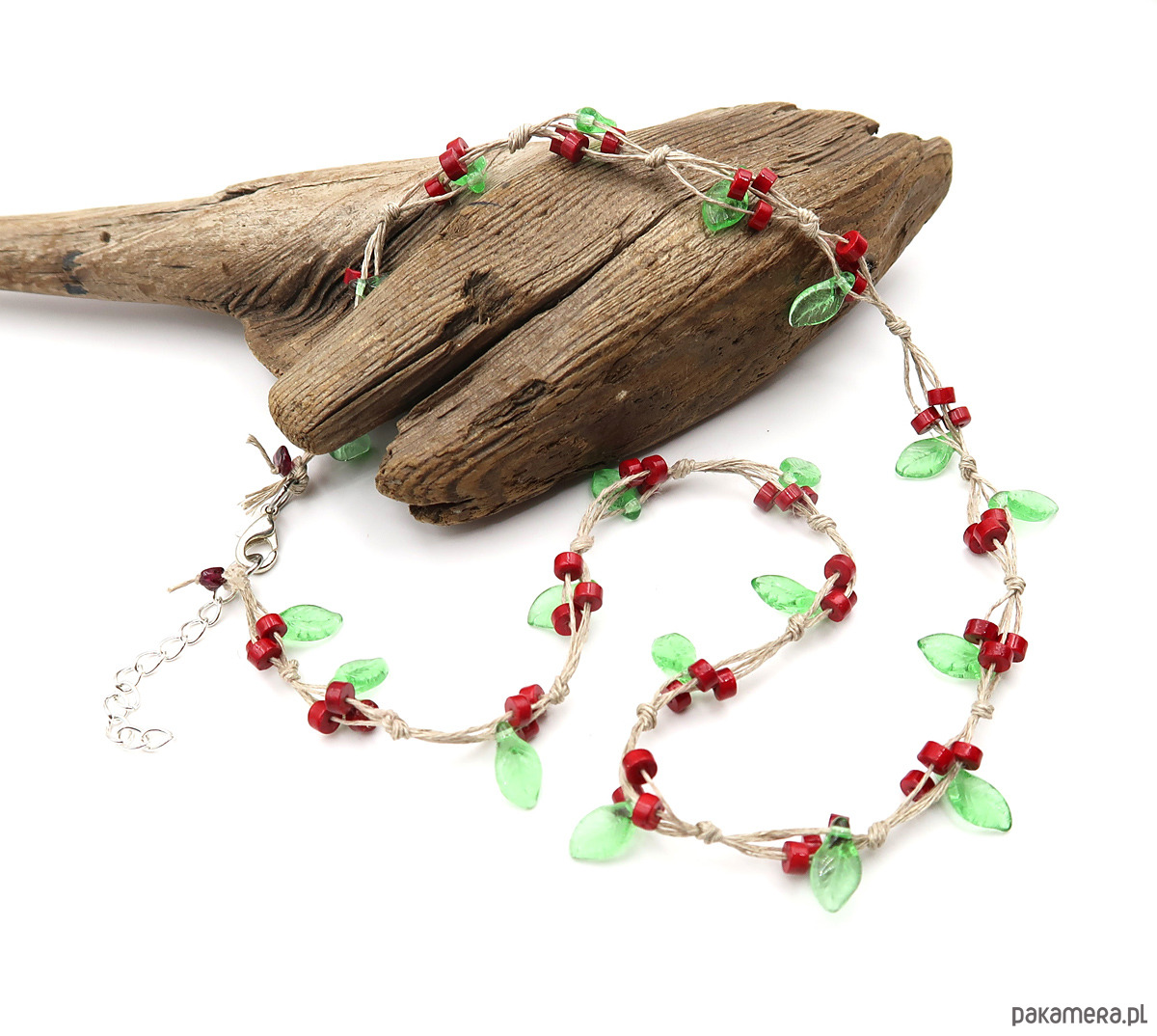 Delikatny naszyjnik wykonany na bazie polskiej przędzy lnianej. Zachwyca soczystą czerwienią i lekką, świeżą zielenią, przywodzącą na myśl letni ogród pełen owoców. W splocie wykorzystano naturalny koralowiec oraz wysokiej jakości czeskie szkło Jablonex, które nadają całości subtelnego blasku.