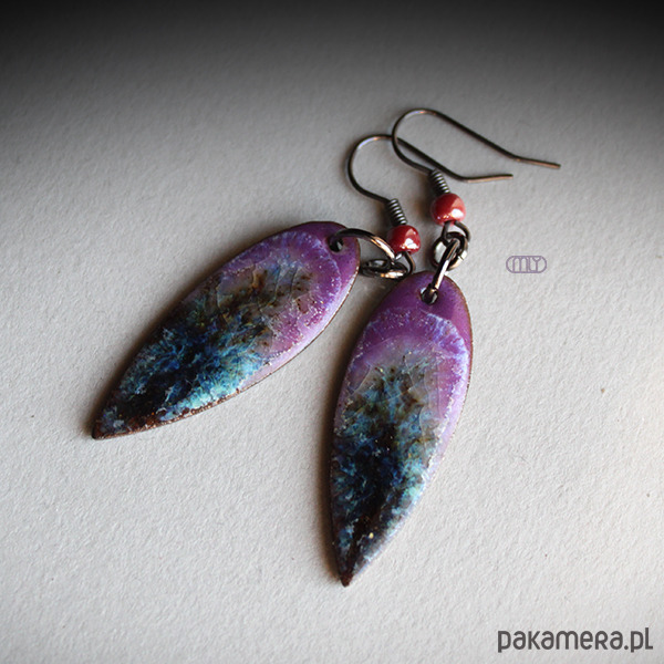 Oryginalne i efektowne ceramiczne kolczyki, ręcznie wykonane z gliny kamionkowej, jednostronnie szkliwione mieszanką zielonych i fioletowych szkliw z efektem drobnych plamek, na biglach w kolorze ciemnego srebra. Długość około 5cm. Polecam