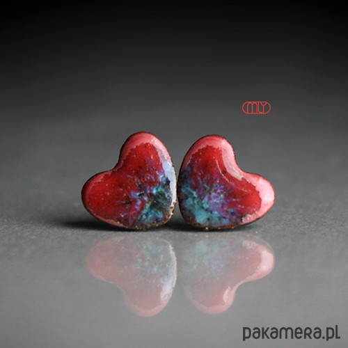Ceramiczne kolczyki w formie sztyftów, ręcznie wykonane z delikatnej gliny kamionkowej, jednostronnie szkliwione czerwonym i zielonym szkliwem z efektem plamek i subtelnym połyskiem, na antyalergicznych sztyftach w kolorze srebrnym.Średnica ok. 12mm.. Polecam