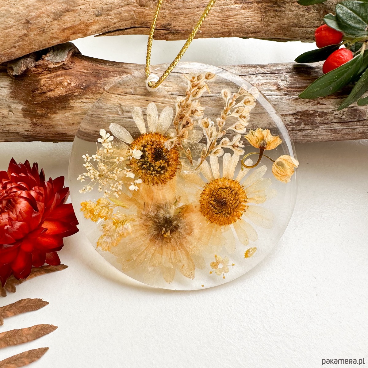 Ręcznie robiona świąteczna zawieszka z suszonymi kwiatami w kształcie okręgu to wyjątkowa dekoracja i niebanalny prezent na choinkę.